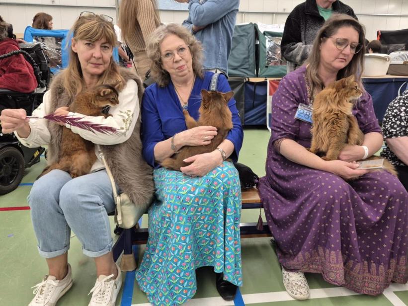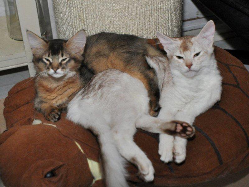 Het mogen meegenieten van de vriendschappen tussen onze dieren is een van de mooiste ervaringen van het leven met huisdieren. Alleen krijg ik die situaties zelden zo op de foto zoals ik ze heb gezien. Met mensen gaat het wat makkelijker. Tijdens de laatste show in Wijk bij Duurstede zag Sylvia die daar aan het stewarden was ons Somalimensen gezellig bij elkaar zitten en maakte daar een foto van. Erg attent van haar. Zo hebben we ne een extra leuke herinnering aan deze fijne show (Sher behaalde haar vierde Best-in-Show in de castratenklasse poezen). Komende zondag is er een show met speciale aandacht voor de Abessijn en Somali. Het is een onafhankelijke show wat betekent dat Fife-leden zoals wij niets aan de eventueel gewonnen certificaten hebben maar zo’n show is ideaal voor de onderlinge contacten tussen Somalivrienden. Zeker nu er veel minder actieve fokkers van ons ras zijn, is het des te belangrijker dat we elkaar en elkaars dieren beter leren kennen. Een van de eerste specials was jaren geleden in de Rai: tweehonderd Abessijnen en Somali’s! Ik ben zo benieuwd naar de opkomst a.s. zondag. Ik neem alleen Sheralyn mee. Zij is een bescheiden dame en raakt snel ondergesneeuwd zodra er een andere kat bij is. Het lijkt me heel goed voor haar om eens de exclusieve aandacht van me te gaan krijgen. Ik verheug me erop!