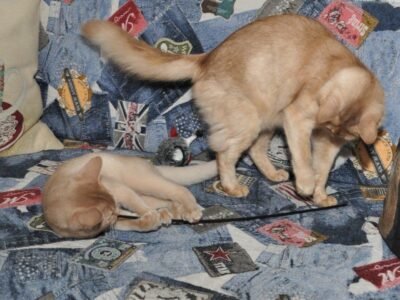 Bij de nestgenootjes van Sheralyn was de hormonale ontwikkeling allang op gang gekomen en daarom zijn zij al gecastreerd. Dat Sheralyn zich veel langzamer ontwikkelt, is kenmerkend voor Somali’s al is dit wel afhankelijk van de lijn en omstandigheden.