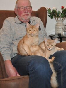 Sijntje en Rooster kwamen in 1998 bij ons wonen, jaren voordat ik een website kreeg. Die kreeg ik in 2005 dankzij Hugo. Hij en zijn vrouw Kristel hadden de prachtige Kala Kalindi. Zo jammer dat het nestje met haar niet gelukt is. Haar enige kitten heeft het toen niet gehaald. Later moest Kala herplaatst worden omdat het niet klikte met de katten die ze van een familielid hadden opgevangen. Gelukkig kwam Kala goed terecht én ‘dichtbij’, nl. bij mijn schoonzusje Nelleke.