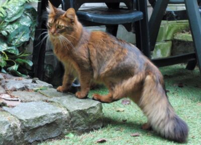 Onze andere stammoeder het zilver Abessijntje Tamara werd al met zo’n acht maanden krols. Op een zeer gedenkwaardige manier: de buren dachten dat we een pauw in de tuin hadden 🙂