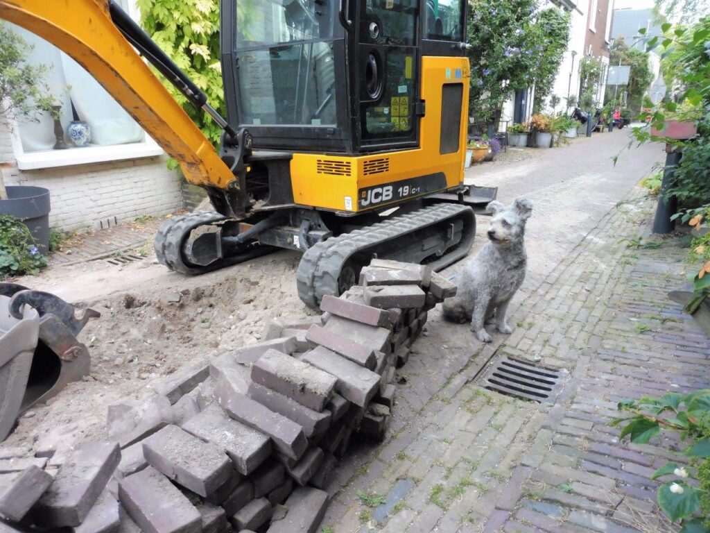 Vanmorgen was er geen sprake van uitslapen. De machines overal om ons heen gingen aan. Niet alleen in de straat maar ook bij de buren waar dakpannen op maat gesneden en houtwerk geschuurd werd. Ook belde de buurvrouw van even verderop met de vraag of Huibert haar hondje uit kon laten want zij kon, ze is slecht ter been, niet over de stapel stenen heen komen die toen voor haar deur lagen. Ik wilde mijn slaapkamer wel uit want de uitlaatgassen waren zo vies dat ik er uren misselijk van ben geweest. Maar alles voor het goede doel: er moeten nieuwe leidingen gelegd worden zodat we in de toekomst bijv. sneller internet gaan krijgen.