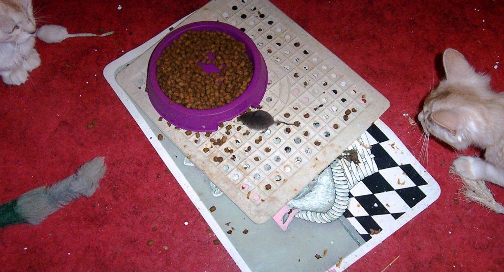 Er kwam nog meer gezelligheid bij maar die viel in de categorie ongenode gasten. Ze drongen zich niet echt op maar gingen wel stiekem mee-eten… Dat was een muizenfamilie in de kamerkast. Ik vond laatst al dat er een luchtje in die kast hing maar ik weet dat aan het plastic afval dat daar vaak even wordt opgeslagen voordat het naar het afvalparkje met de ondergrondse containers wordt gebracht. De aangevreten zak kattenbrokjes is weggegooid, de hele boel is uitgesopt en Huibert heeft met de kitspuit wat kiertjes dicht gemaakt. Nu maar hopen dat de muisjes gaan emigreren. Ik had ze nooit horen rommelen en de katten hadden ook niets aangegeven. Het was al heel erg lang geleden dat er zich een muisje hier had gemeld. Ooit had, vast een verre voorouder van deze familie 😉 zijn weg gevonden naar diezelfde kast. De kier toen had Huibert dichtgezet met een plastic schrootje en een paar avonden achter elkaar hoorden we hem krabbelen tegen dat schrootje wanneer hij op weg was naar zijn snack.