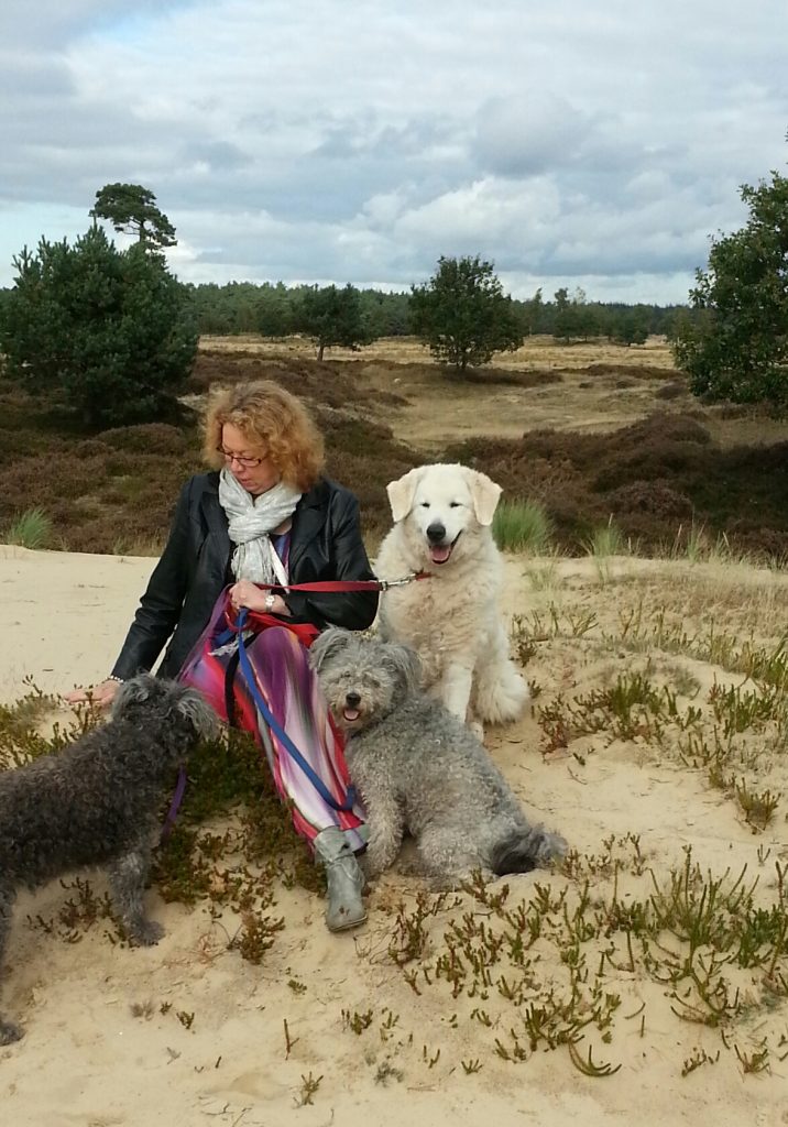 Ik met onze drie honden in 2012; Eesz en Pici zijn op 16-jarige leeftijd overleden maar we hebben Polly de Pumi nog.