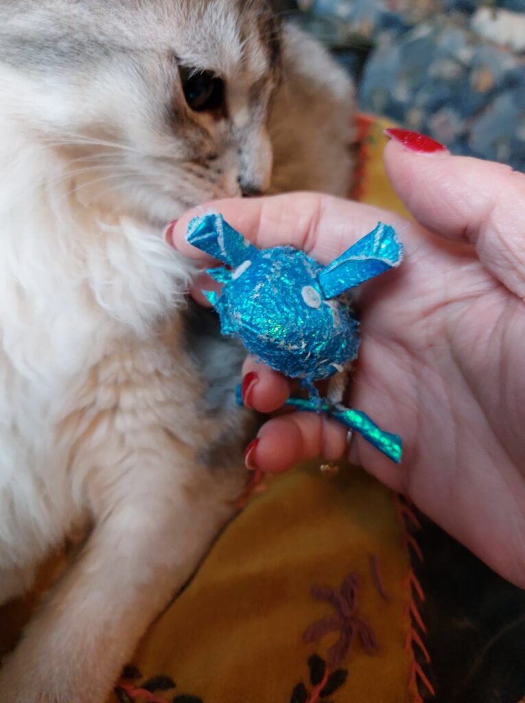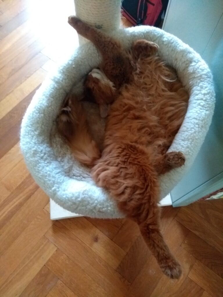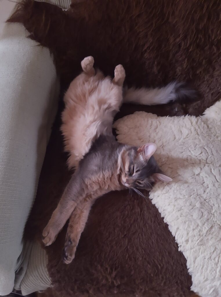 De kittengym, het woord zegt het al, voor kittens is bedoeld, is ook geliefd bij de volwassen katten. Als Sheralyn er niet ligt dan ligt Orchid er wel. Met Sheralyn lijkt alles heel goed te gaan. Aan haar eetlust mankeert ook niets alleen vindt ze nog steeds dat Bodiir niet te dicht bij haar mag komen. Haar instinctieve incestbescherming voert ze wel ver door. Op dit moment ligt Sheralyn in het mandje naast mijn stoel en Bodiir ligt heel onschuldig en zoet met een springveertje te dollen, heel toevallig 😉 ? tussen ons in.