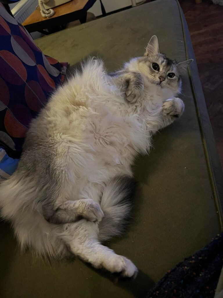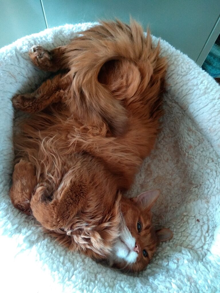 Ooit voerden we de gewoonte in om onze dieren ‘s morgens een ontbijt van KVV, dus iets als Carnibest, voor te zetten in plaats van het geijkte voer uit blik. (Brokjes als maaltijd hebben we ooit ook voor een korte periode gedaan, helaas met fataal gevolg.) Dat was de beste verandering die we ooit hebben ingevoerd. We hadden al geen echte gezondheidsproblemen bij onze dieren alleen waren er wel een paar die een gevoelig maagdarmsysteem hadden (minder goede ontlasting bijv.) wat ook aan de vachtjes te zien was. Na deze omschakeling was dit acuut verleden tijd. Onze mooie Elvira van weleer heeft best wel last gehad van haar darmpjes en iedere twee maanden zette ik haar in de rijstzetmeel om haar vacht klitvrij te houden. Hieronder een aantal foto’s van haar.
