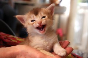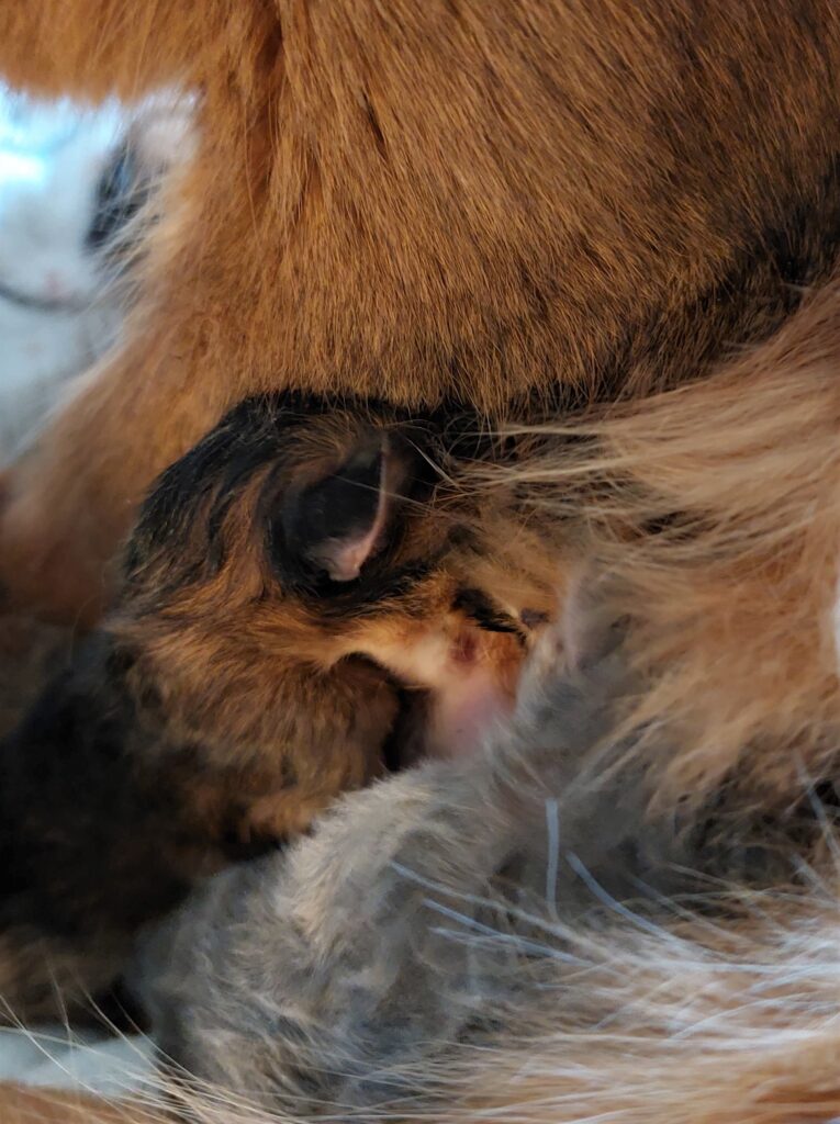 Het eerstgeboren poesje woog 106 gram, de blauwe dame 102 en het tweede wildkleur poesje 96 gram maar een paar uur later wogen beide wildkleurtjes bijna evenveel. De eerste was flink afgevallen en de tweede was keurig gegroeid. Het blauwtje voer ik ook bij zodat het eerste wildkleurtje vaker de kans krijgt om zelf te drinken. Ook zet ik de mand af en toe op mijn schoot. Dan probeer ik wat van de stuwing weg te masseren en de kittens te overtuigen om ook die andere tepels te gebruiken. Poesje I was door de honger behoorlijk hyper en maakte veel misbaar tijdens de voedingen maar toen ze een paar slokjes uit zo’n gemasseerde tepel binnenkreeg, begon ze zo schattig knetterend te spinnen. Dit had ik ook even nodig want al die zorgen om je kwetsbare diertjes tikt behoorlijk aan.