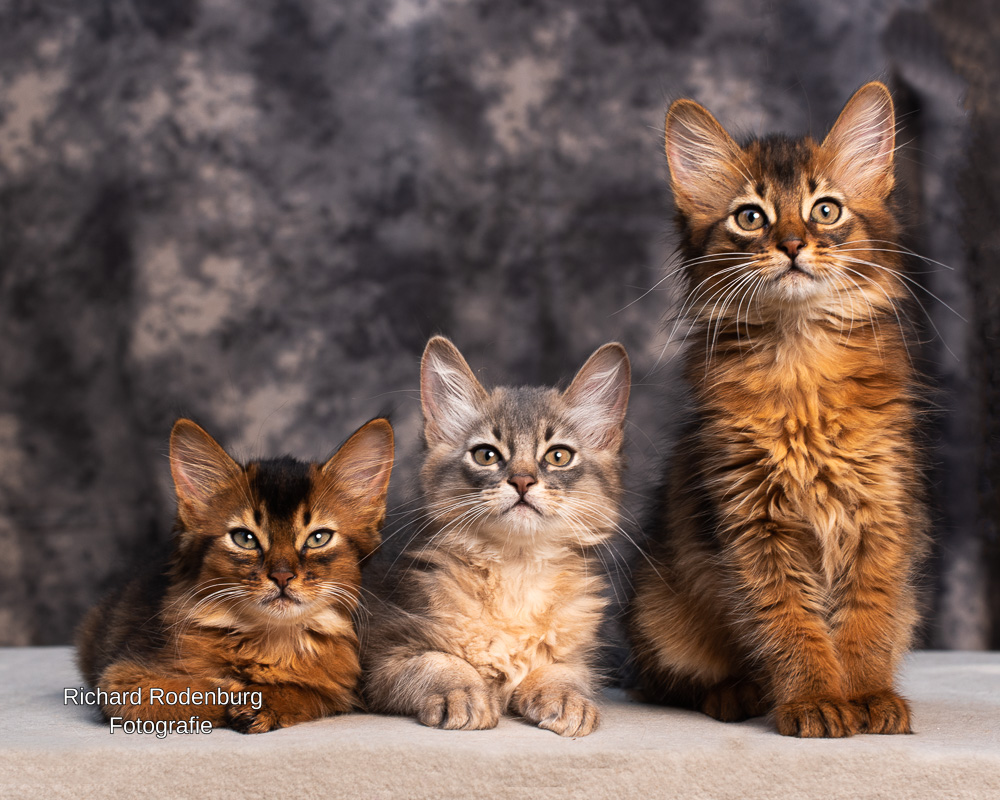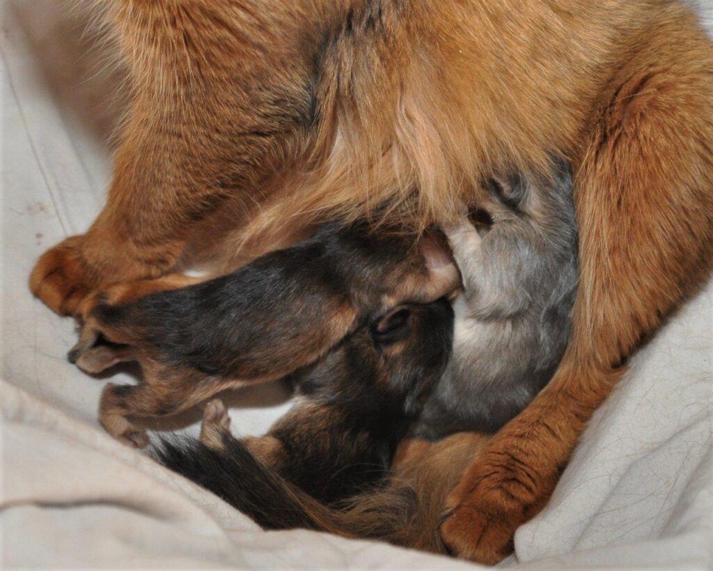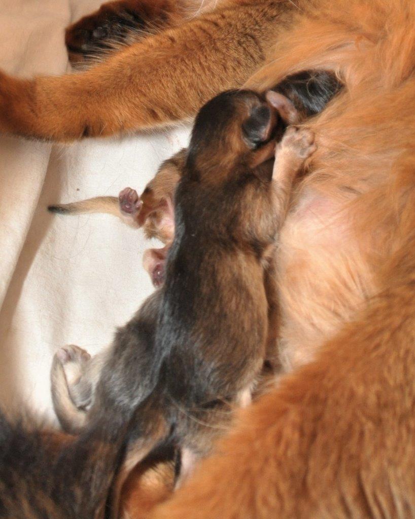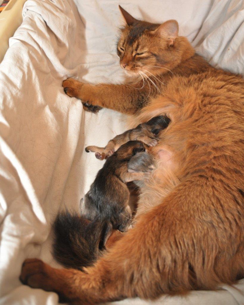 Na een zeer voorspoedige bevalling is de wereld drie schattige Somalietjes rijker geworden. Ik denk nu dat Sheralyn drie poesjes heeft gekregen: één blauwtje en twee wildkleurtjes.