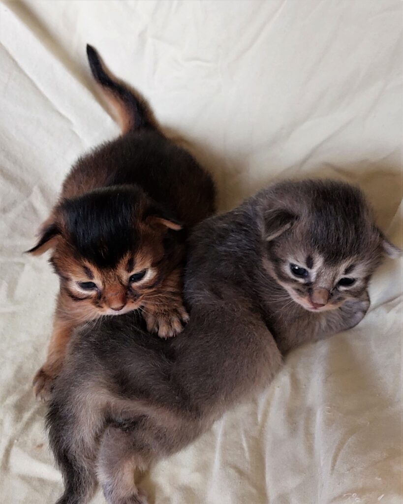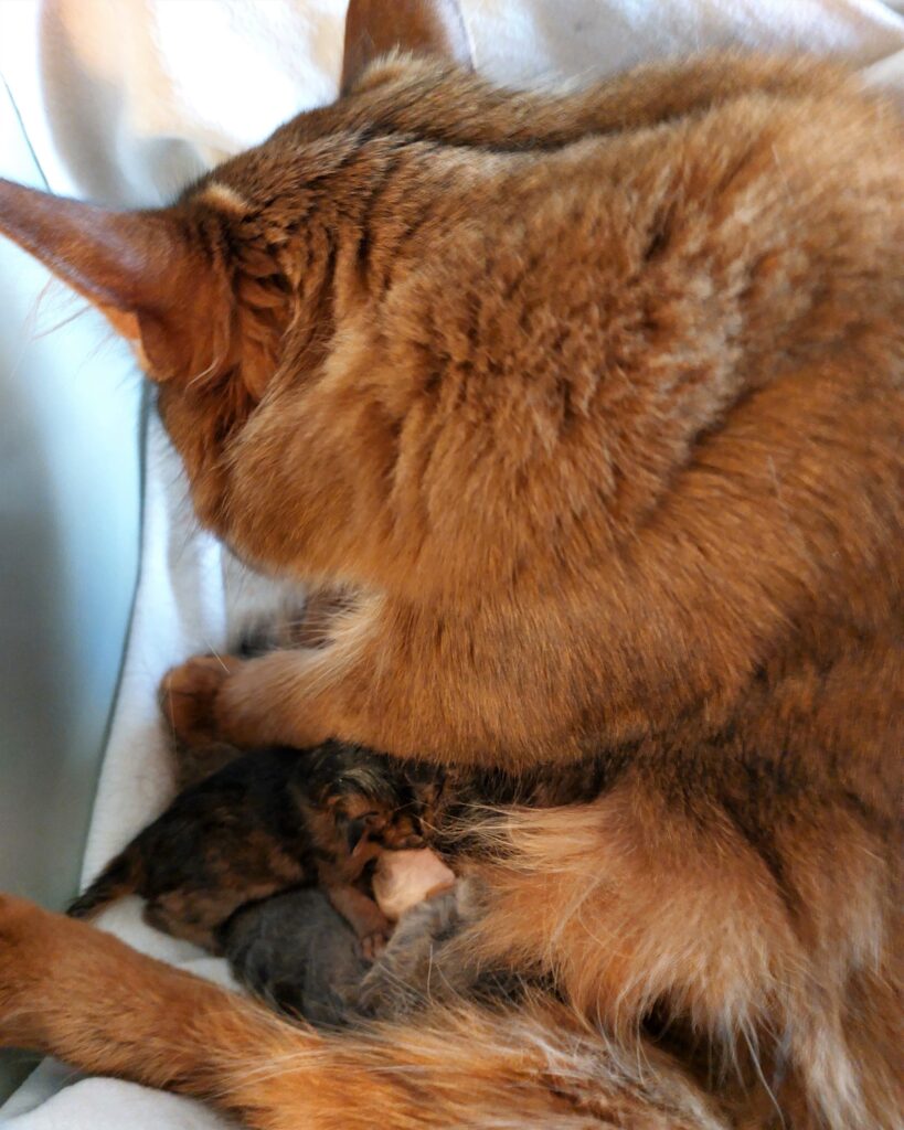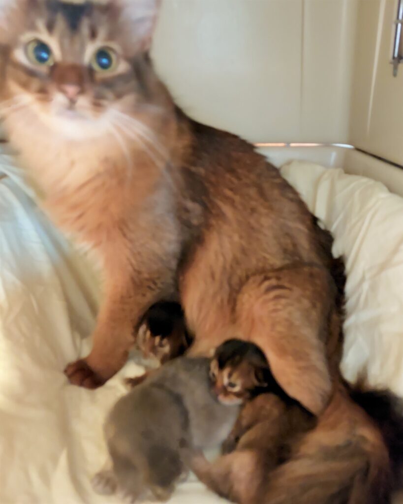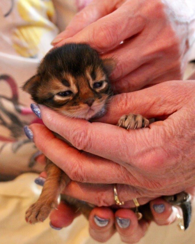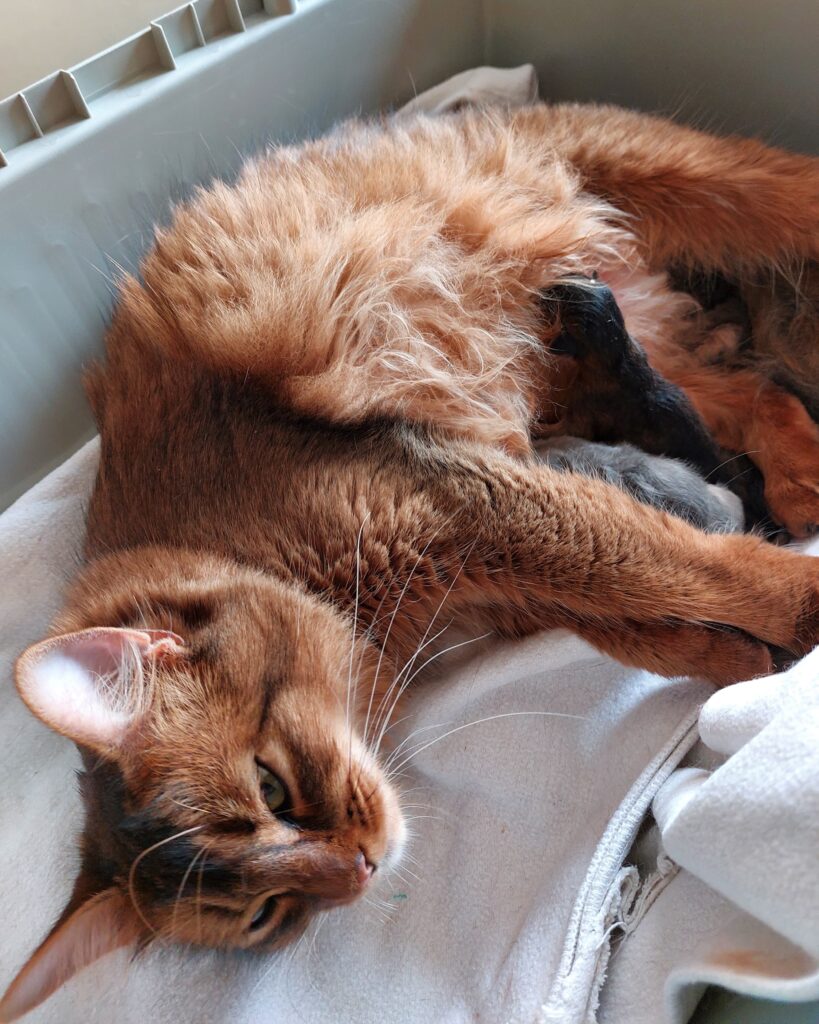 Na een zeer voorspoedige bevalling is de wereld drie schattige Somalietjes rijker geworden. Ik denk nu dat Sheralyn drie poesjes heeft gekregen: één blauwtje en twee wildkleurtjes.