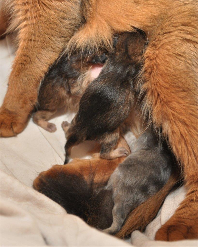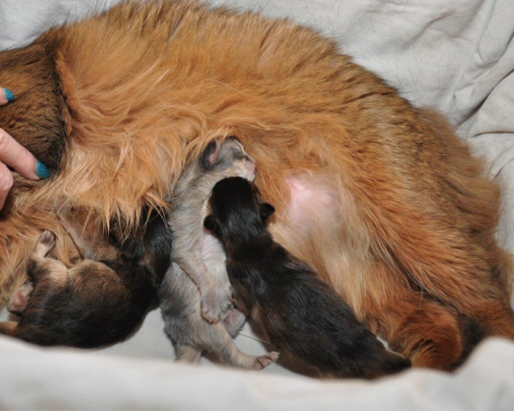 Goed nieuws. Alle drie de kittens drinken zelfstandig bij Sheralyn en haar melkklieren die zo opgezwollen waren, zijn ook weer genormaliseerd. Het Grote Genieten is aangebroken. Ze kunnen zo heerlijk spinnen wanneer ze aan het drinken zijn. Ontroerend! Sheralyn is een supergoed moedertje. Af en toe maakt ze even een rondje om haar pootjes te strekken en om even beneden naar een kattenbak te gaan want haar instinct vertelt haar dat er geen kattengeurtjes in de buurt van haar nest mag zijn.