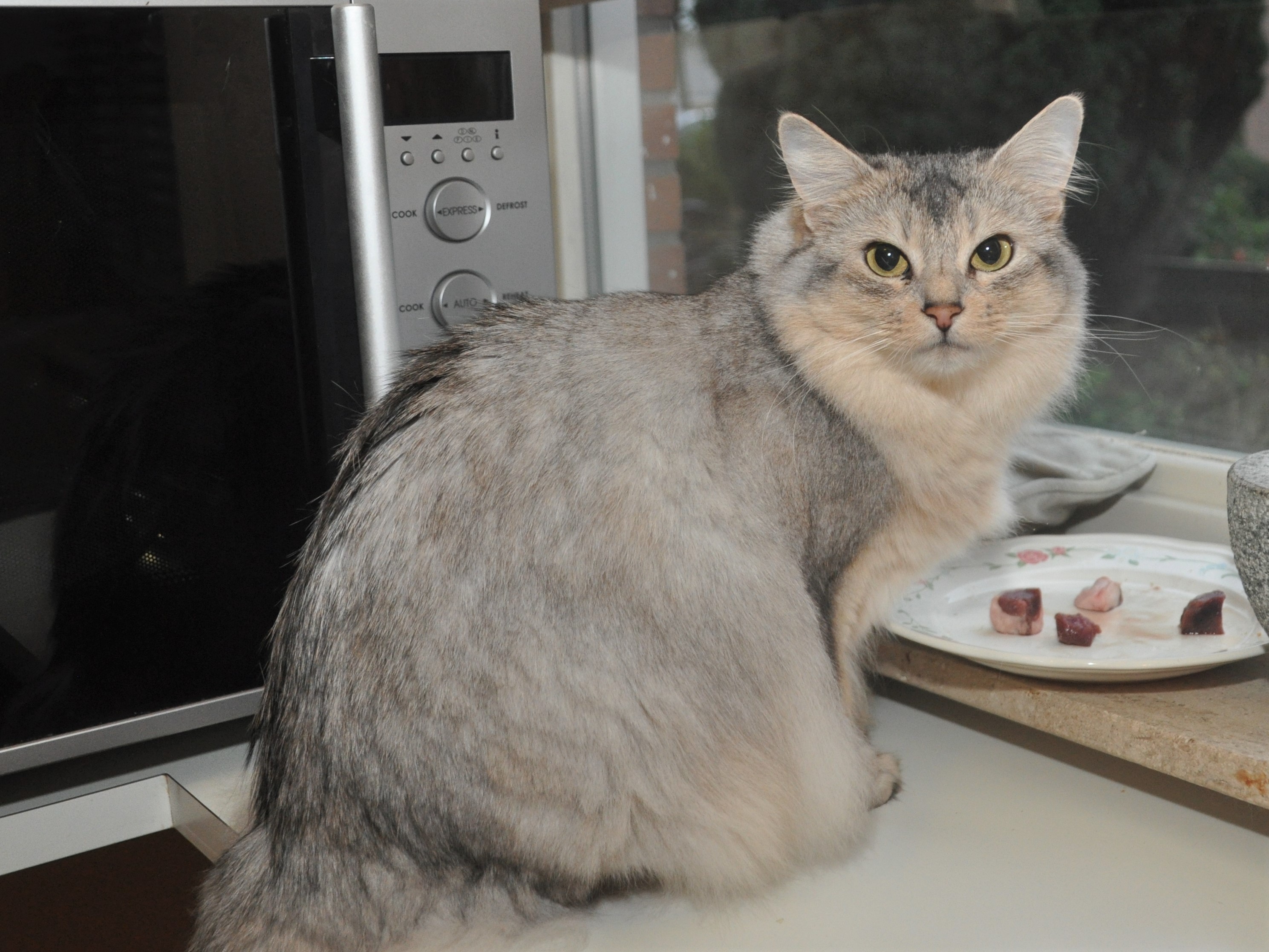 Gelukkig hebben we nog meer zonnetjes in huis én Wiesje is natuurlijk het toppunt van een zonnestraaltje. Net als Umione heeft zij de gewoonte om altijd hardlopend naar je toe te komen wanneer zij geroepen worden. Sinds zij het op het aanrecht springen onder de knie heeft, is er een wereld voor haar open gegaan. Ook voor ons: we hebben nu een katje in huis dat werkelijk de voor katten meest ongewone etenswaren verorbert. We hoorden dit wel van andere katten maar Wiesje lust echt bijna alles: van rauwe en gekookte tagliatella, komkommer, rozijnen, maar geen cranberries, walnoten tot watermeloen. Over ordentelijk kattenvoer denkt zij helaas anders; gekookte koolvisfilet, zalm en kippenlevertjes lust zij niet (meer). Gelukkig lust ze wel alle soorten kattenvoer uit blikjes, kuipjes en zakjes dus in voorkomende gevallen leuk ik haar portie even op met een klein vorkje van dat spul.