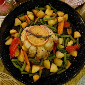 Wat ook nieuw was, was een kipgerecht van de biologische slager van de Botermarkt (vrijdag). Deze mensen hebben zulke heerlijke producten dat ik graag mijn fietsje pak om wat heerlijkheden op te halen. Alleen was ik deze dag wat aan de late kant want er was al aardig wat uitverkocht. Geen pie’s deze week… Onze favoriet is de vegetarische linzenpie. Toen viel mijn oog op een stuk mooi opgemaakt kippenvlees: 180 graden, uurtje oven, wat aardappeltjes en groentes eromheen en je hebt iets heerlijks op tafel.