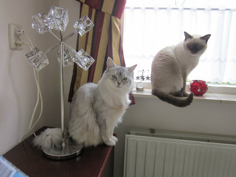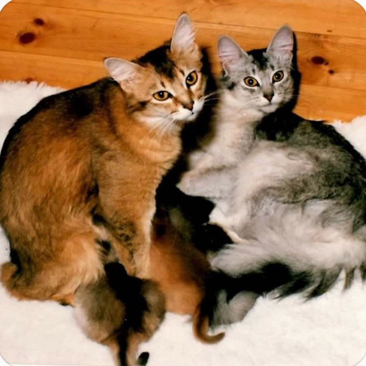 Oentje ontfermde zich vanaf dag één als een zorgzame grote zus over de kleine zilveren meid. En wat waren we blij met Silvie: onze eerste zilveren Somali. Deze droom hadden we al vanaf het moment nadat de fokster van onze eerste twee poesjes ons vertelde dat het mogelijk was om zilver Abessijnen te kruisen met Somali’s en met een beetje geluk kon je na een paar generaties al Somali in een zilveren bontjas verwelkomen.
