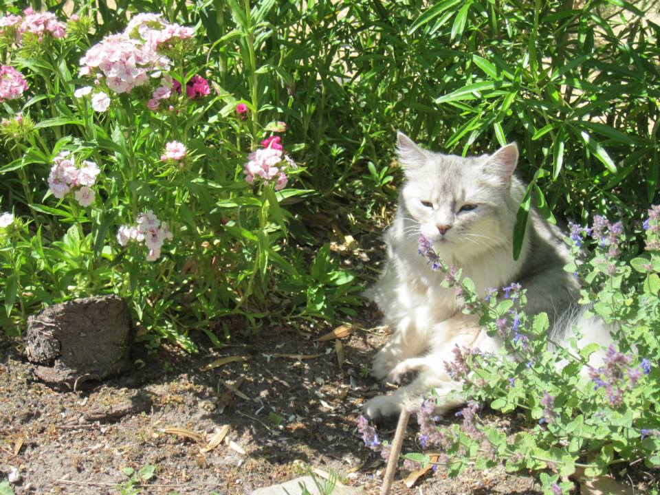 Silvie was al snel gewend aan onze andere katten. De honden vond ze in het begin wel een beetje eng. Pleegzus Oentje bleek onbetaalbaar in het wegwijs maken van de kleine meid. Toen zij een keer zag dat Silvie graag van de achterkamer naar de voorkamer wilde maar niet langs de grote witte Dimbo durfde, ging zij tussen Dimbo en Silvie lopen zodat het voor haar minder eng was.