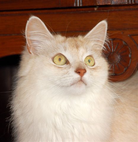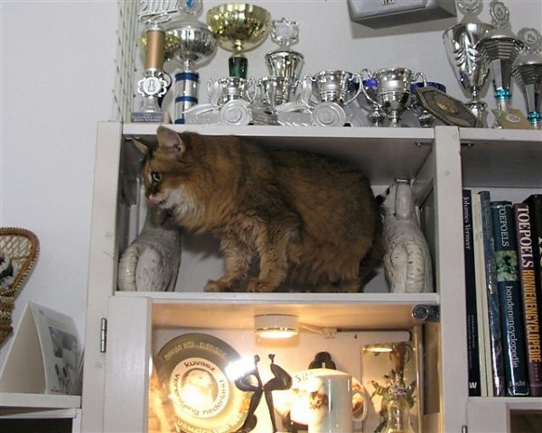 Wat wel goed lijkt te gaan is de medicatie voor Mariposa. Met haar zijn we al een hele tijd in de weer en eigenlijk ging ze alleen maar langzaam achteruit. Op een gegeven moment werd ze onzindelijk wat gelukkig door de toen gestarte medicatie meteen over was maar wat ze evengoed nog in de kattenbakken produceerde, maakte me niet blij. Niets hielp afdoende tot ik begin van de week een collegafokker sprak die me uitlegde wat de werking van het medicijn Finidiar was. Jaren geleden had ik dit wel eens gebruikt voor Sijntje maar dat deed niets; ‘dus het middel werkte niet’. Sijntje bleek een allergisch darmprobleem te hebben en zo lang zijn maar geen fabrieksvoer eet, heeft zij geen darmprobleem. Finidiar slaat echt aan bij Mariposa. (2017: dit middel heeft als eigenschap dat het toxines etc. neutraliseert waardoor er rust in de darmen komt. De naamgeving, het heet nu Diarstop, is eigenlijk minder ideaal dan het middel zelf). Ondanks alle zorgen ziet ze er fantastisch uit; ze heeft er ook nooit slecht uitgezien. Ze was ook nooit echt ziek. La Posita moest natuurlijk voor de gelegenheid op de foto en dat vindt ze helemaal niet zo geslaagd. Op de foto zie je dat ze haar bekje aflikt – dit noem je het stresstongetje en dat is een uiting van stress. Met een extra knuffel heb ik het evenwicht weer hersteld, hoop ik 🙂