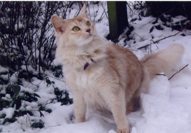 De kerstkaarten beginnen binnen te komen en sommige kittenkopers zijn zo lief om een foto bij te sluiten van hun Silfescian. Deze is van Jan en Marleen. Hun Jaimie, officieel Felicity Jane, dochter van Juultje en Rooster, afgelopen maart in de onverwachte sneeuw. Daar hebben onze katten ook veel plezier mee gehad.