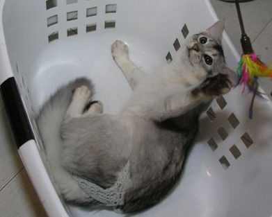 Was Tresca gisteren jarig, vandaag is de beurt aan Maverick, maar dan ‘halfjarig’: hij is vandaag precies zes maanden oud en dat hebben we ‘gevierd’ met de eerste oefening van het dragen van het katerbroekje. In tegenstelling tot wel gedacht wordt, is zo’n broekje niet bedoeld om ongewenste dekkingen te voorkomen (dat kan heel wreed zijn om dat een kater aan te doen en het is ook niet echt betrouwbaar) maar om de kater huiselijk verkeer te geven wanneer hij zou gaan sproeien, iets wat nu eenmaal des katers is na het volwassen worden. We hebben wel een kattenkamer, zelfs met buitenrennetje, maar wij vinden dat een kat een huisdier is en dat ook dekkaters zo veel mogelijk als een huisdier moeten kunnen leven. Dit is echt geen luxe voor een kater want het gebeurt nog steeds dat een exdekkater na zijn fokcarrière wanneer hij van het normale leven buitengesloten was, helemaal mislukt. Die prijs voor leuke nestjes is onacceptabel hoog. Daarom waren Nieckje en Tresca ook uit logeren bij katers die ook huiselijk verkeer krijgen. Het is al niet makkelijk om passende katers te vinden, je moet op de gezondheidstesten letten, de afstamming, de huisvesting, het algehele fokbeleid en dan ook nog het welzijn van de kater na zijn fokcarrière. We waren dan ook blij verrast dat het dit jaar weer gelukt is bij katers in ons eigen land.