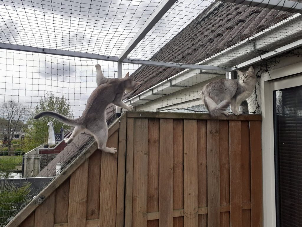 Na wat haar onderzoek voltooid te hebben komt ze naar me toe en ploft naast me op de bank. Even later denk ik er goed aan te doen haar ook het balkon te laten verkennen dus loop ik naar de schuifpui en maak aanstalten om deze te openen. Tinka reageert opgewonden en blij en komt naar me toe gerend. Daarbij loopt ze langs de kooi van Nicky en die schrikt daar van. Luid begint Nicky de alarmbellen te luiden, de bekende waarschuwing. Ik heb meteen weer meer dekens en spreien gepakt om het zicht weer weg te nemen. Het gaat dus helemaal niet goed,… dit is slecht! Ik moet ervoor gaan zorgen dat ze elkaar niet meer kunnen aankijken. Dus ben ik meteen gaan bouwen met alles wat ik kon vinden heb ik nu twee kooien naast elkaar staan. Ik blindeer steeds de kooi waar een poes in zit en de twee kooien lijken nu op 1 grote kist. Dat snappen katten dus niet, zodra ze in die “kist” gaan hebben ze niet in de gaten dat ze maar de helft in gebruik hebben. Die illusie wil ik volhouden, sindsdien heb ik ze om en om steeds in de kooi.