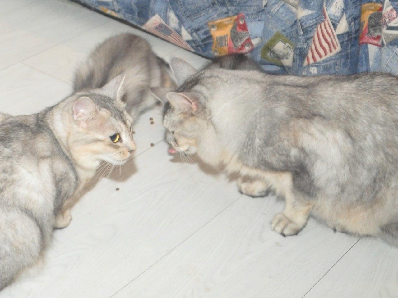 Over hun eten. Er verdwijnen complete rauwe kippennekken in hun maagjes. Eerder blieften ze het rauwe rundvlees niet en moest ik list en bedrog toepassen om ze het wel te laten eten. Inmiddels hebben ze hun vergissing ingezien en eten ze het wel. Hacheevlees was een paar keer in de aanbieding en die dikke stukken waren een groot succes. Lams-/schapenhart krijgen ze hier vaker, evenals alle soorten kippenvlees al dan niet met bot en verschillende soorten vis. Voor hun nieuwe eigenaren ga ik een overzichtje maken van de verschillende maaltijdjes zoals ze die hier krijgen. De brokjes zijn nog geen succes. Tot mijn verbazing eten de zwartzilvertjes ze wel maar de kleurlingetjes, het sorrelzilveren katertje Oliver en het wildkleurtje Murphy, vinden nog steeds dat ze het heel goed zonder brokjes kunnen stellen. Alleen wanneer ik de brokjes even overgiet met heet water en opleuk door er wat makreelfilet of iets uit een blik of kuipje door prak, eten ze het. Het andere droogvoer wat ze wel allemaal goed eten is de zelf-gedroogde kip. Ik kon laatst een aanbieding dijbeenfilet op de kop tikken en dat vlees hebben we gedroogd. Ik wist dat dit een vettere vleessoort is maar met het drogen viel op dat het inderdaad stukken vetter was. Maar lekker dat ze het vonden! Huibert had het ook wat dikker gesneden zodat ze er een goede kluif aan hadden.
