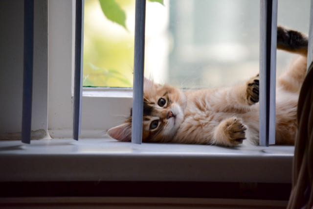 Een aantal weken geleden schrok Baldr verschrikkelijk toen hij achter in de keuken was en zijn moeder net door het kattenluikje binnenkwam. Met zijn kattenverstandje werd hij geconfronteerd met een kat die opeens uit een deur stak. Zo denkt hij er gelukkig al lang niet meer over – hij én de anderen hebben ontdekt dat er een hele interessante wereld achter die luikjes te vinden is. Beneden komen ze dan eerst bij de échte kattenbakken met silicavulling, die hebben nu ook hun voorkeur, en dan een hele spannende tunnel die uitkomt in een kattenparadijs. Boven is er ook iets soortelijks alleen zonder een laag beukenblaadjes. Dit betekent dus wel dat we wel moeten bijhouden waar ze uithangen. Met hun royale vachtjes zijn temperatuursschommelingen geen probleem voor ze maar ze zijn nog te kwetsbaar om zonder toezicht al te lang buiten te zijn.