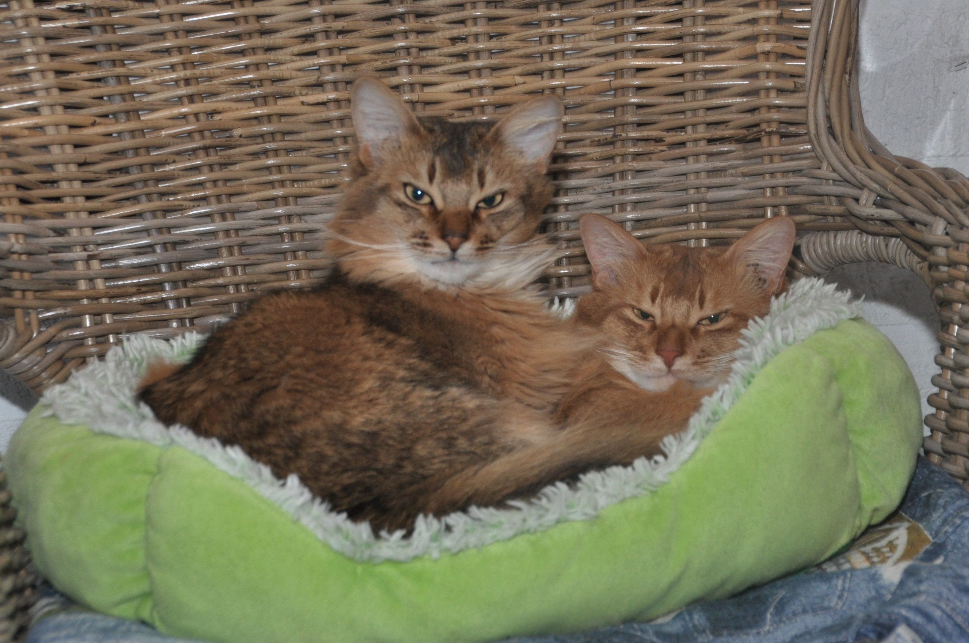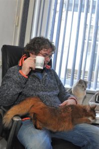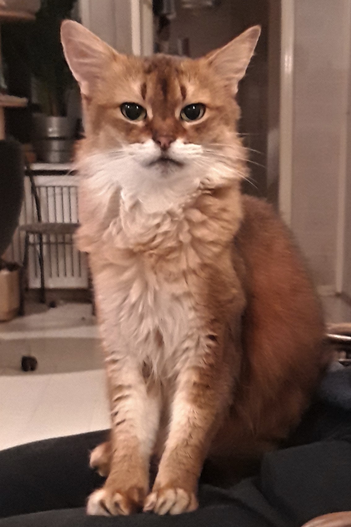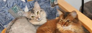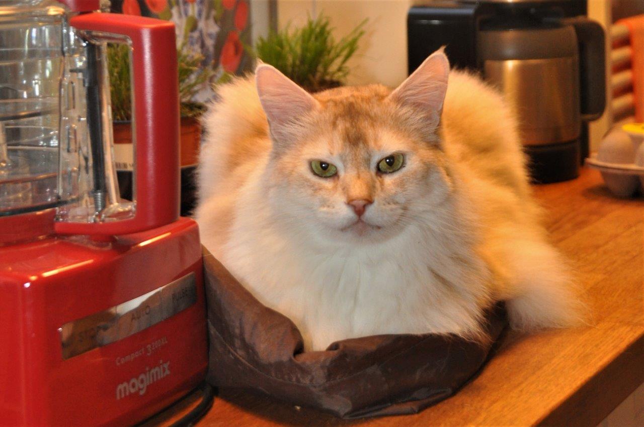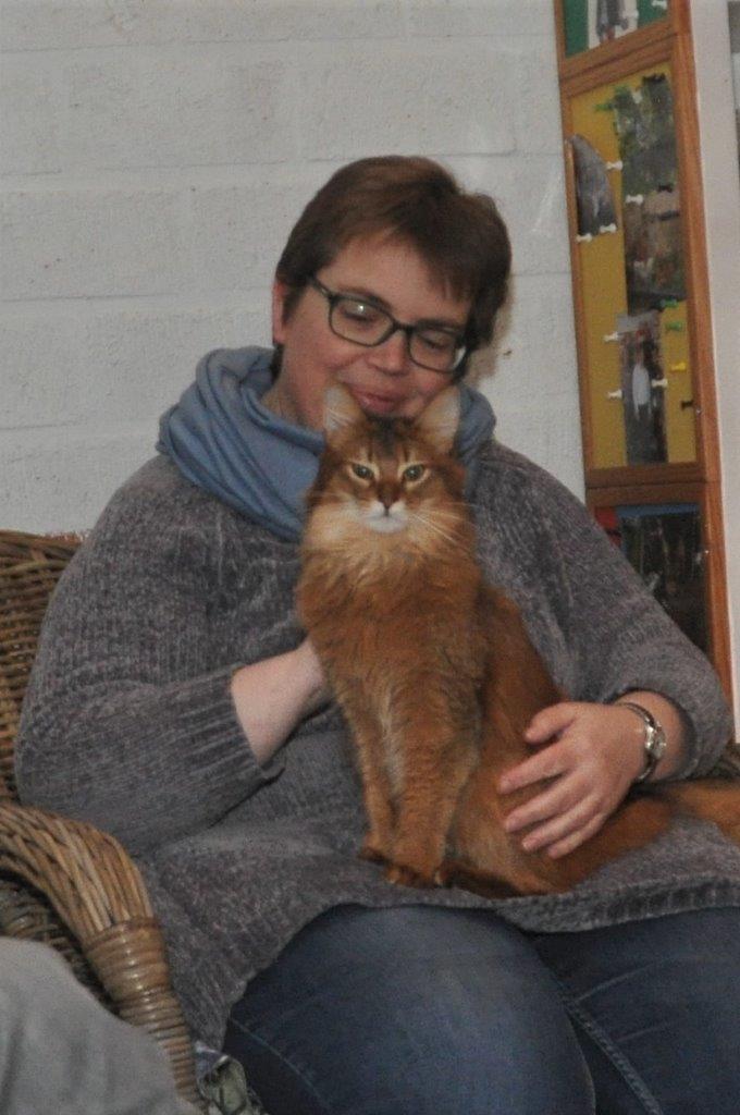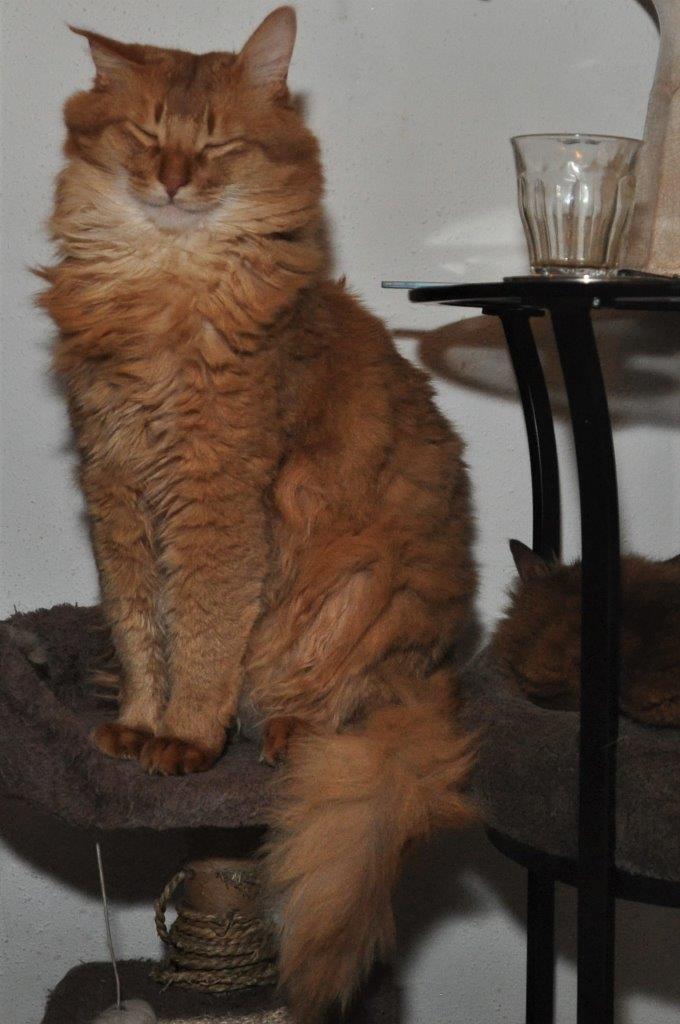 Een van de vragen was of de Somali een gezellige schootkat is. Geen enkele Somali zoekt op dezelfde manier contact met zijn mensen. Ze hebben allemaal hun eigen gewoontes. Onze My’nie is als jongste bediende hier in huis het ultieme plakkatje en zij houdt het ‘bij je liggen’ echt heel erg lang vol. Maverick was altijd bijzonder onstuimig en te onrustig om lang te blijven liggen. Nu met zijn twaalf jaren gaat dit hem beter en voor mij prettiger af. Sommige van onze katten trekken meer naar Huibert toe en dat is wel zo handig zodat iedereen in de loop van de dag zijn knuffelmoment kan halen. Het lijkt soms wel alsof ik schootspreekuur houd: de ene is net opgestapt of de ander staat al weer klaar. De meesten zijn er te trots voor om te laten merken dat zij ook wel willen maar ze houden het schootbezoek vanuit hun ooghoekjes in de gaten. Toevallig nu niet. Dat schrijft wel zo makkelijk.