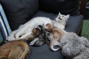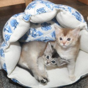 De kraammand voor Elfie staat al vanaf dat ze 4,5 week zwanger was klaar en is bij iedereen enorm favoriet. Op een ochtend zat Orchid erin en Bashiir lag ervoor. Toen hij mogelijk aanstalten maakte om er ook in te kruipen, deelde Orchid tikken uit. Duidelijk taal van onze oudste dame. Maar Bashiir stelde dit minder op prijs. Toen Orchid op een gegeven moment weer aan de wandel ging, liep hij haar na en sprong hij bovenop haar. Zijn intimidatiepoging had weinig effect: Orchid bleef staan en keek alleen wat verstoord om zich heen. ‘s Avonds in de huiskamer ondernam Bashiir weer een poging om Orchid te belagen en deze keer schrok ze wel… Dit bleek tot onze verbijstering de trigger voor een schrikreactie bij Elfie en haar reactie riep agressie bij Bashiir en Sher op met als resultaat een kluwen van drie vechtende katten. Gelukkig hadden we ze met een tel uit elkaar maar vooral Elfie was enorm onder de indruk (ze had zelfs haar urine laten lopen).