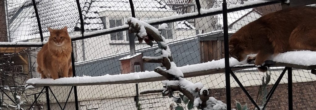 Flirten, My’nie was nog krols, vanaf de vensterbank met de door de sneeuw ploeterende voorbijgangers ligt haar beter. Later op de dag, toen het niet meer sneeuwde was het wel dolle pret. Umione ging voluit samen met Sher en Bashiir. Elfie is wat voorzichtiger maar kon zich uiteindelijk ook niet meer inhouden.