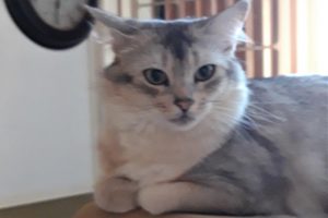 Dat schootliggen wordt straks wat lastiger voor Elfie. Elfie is flink aan de maat maar met wat goede wil van twee kanten lukt het nestelen op mijn schoot vóór mijn laptopblad nog steeds… Sinds haar logeerpartijtjes bij de dekkater is ze nog aanhankelijker geworden dan ze al was. Haar miauwtjes zijn, wanneer een van ons een jas aantrekt, heel ontroerend. Bij Huibert gaat het haar meer om de stukjes gedroogde kip in zijn jaszak (gebruikt hij als trainingsmateriaal voor Polly) maar bij mij is het echt 😉 Het op schoot liggen vóór de laptop zal zeer waarschijnlijk wat lastiger gaan worden omdat wij onlangs konden vaststellen dat zij zwanger is. Zondag 20 januari was het de 21ste dag. De dag ervoor was er nog niets waarneembaar aan haar tepeltjes. Die waren nog net zo klein en amper vindbaar als altijd maar zondag bleken ze makkelijk op te sporen in haar royale zilveren vacht. Toen ze ook nog aan het kroelen sloeg met webmaster Victor en voor het betere buikaaiwerk op haar rug ging liggen, kon Victor ook meteen zien dat haar tepeltjes groter en een tikje roze waren.
