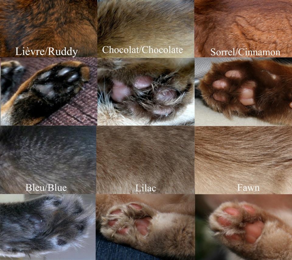 Zo’n kleuroverzichtje moet ook bestaan van de verschillende zilverkleurslagen. Je kan het je haast niet voorstellen maar de wildkleur (en dus de zwartzilver) zijn genetisch zwarte katten. Als zij het gen voor ticked tabby niet zouden hebben, zouden ze effen zwart zijn. En de sorrel/cinnamon effen kaneelkleurig etc. De streep over de staart en de haren rondom de voetkussentjes tonen de werkelijke kleur.