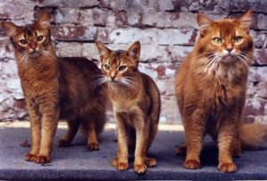 Op deze foto uit 2002: Unique van Bois le Duc (Nieckje) , het Abessijn-variant poesje Silfescian Rosi’s Eve (Evie) als kitten met hun vader Moonschea Sungold Firesong (Rooster).