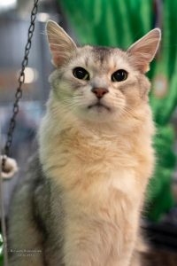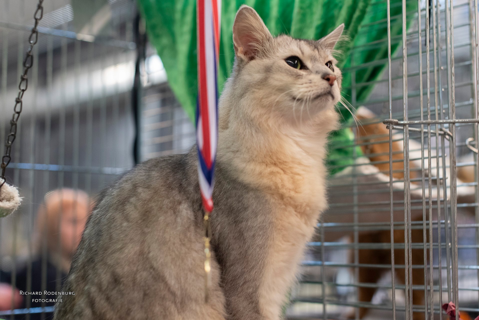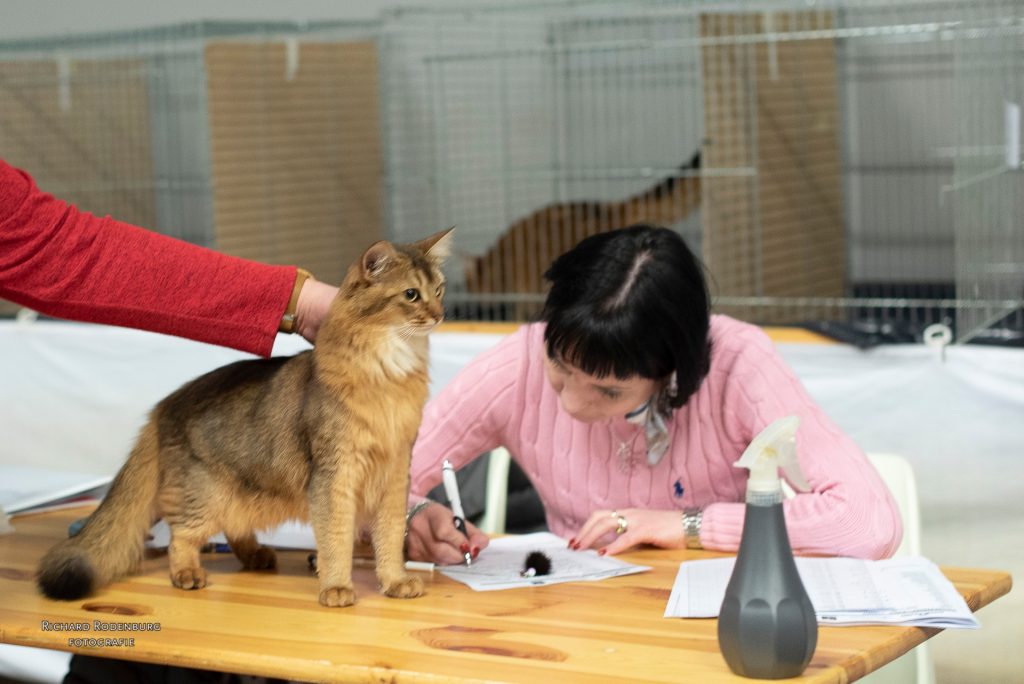 Sher staat heel rustig op deze foto van de keuring op zaterdag maar in haar eigen kooi bij dochterlief Umione was ze dat juist niet. Blijkbaar maakte ze zich bezorgd over haar dochtertje. De volgende dag, zonder My’nie, was er niets met haar aan de hand. Ze gedroeg zich volmaakt. Alleen nu raakte papa Bashiir in de problemen. Het begon al met een heel hard mauwende Bengaal even verderop en wat later schrok hij enorm van een vriendin die een voor hem bedreigende geur meebracht. (Bij ons thuis komt hij gewoon bij haar op de bank). Onze lieve rode vriend was beter af in een eigen kooitje. Huibert nam zondags de honneurs waar en kreeg hem weer rustig door een gordijntje gedeeltelijk voor de kooi te hangen. Zo kon hij gluren naar al die mensen, voelde hij zich veilig en was alles in orde. Bashiir won ook zijn certificaat. Hij was al kampioen en premior en nu heeft hij zijn eerste certificaat voor de titel Internationaal Premior.