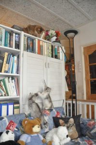 Het gaat echt super met moeder Elfie en haar kinderen. Ze zijn alle drie zo tevreden. Elfie is niet alleen op een leuke manier bijzonder zorgzaam; ze speelt, rent en stoeit ook met ze. We hebben een heel ruilschema zodat de kittens zo goed mogelijk gesocialiseerd kunnen worden en dat Elfie iedere dag ook zo veel mogelijk mee kan maken. Ze krijgt ook niet de kans om zich te vervelen: de kittens gaan al door de luikjes en halen acrobatische toeren uit in de tuin en op het dakterras dus ze heeft haar kattenpootjes vol om op de kleintjes te blijven letten.