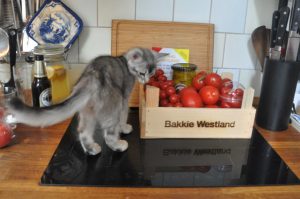 Aan hun, en Vidars oudere broertje Baldr, lange wachten is bijna een eind gekomen. Als de vaccinatie goed valt, brengen we hem na een dag of zeven naar zijn nieuwe thuis; in het Westland. Westland is bekend om zijn groenteteelt en daarvan hadden ze een collectie van meegenomen. Heerlijke tomaten in alle soorten en maten en zelfs ingemaakte. Vidar heeft er natuurlijk even bij geposeerd.