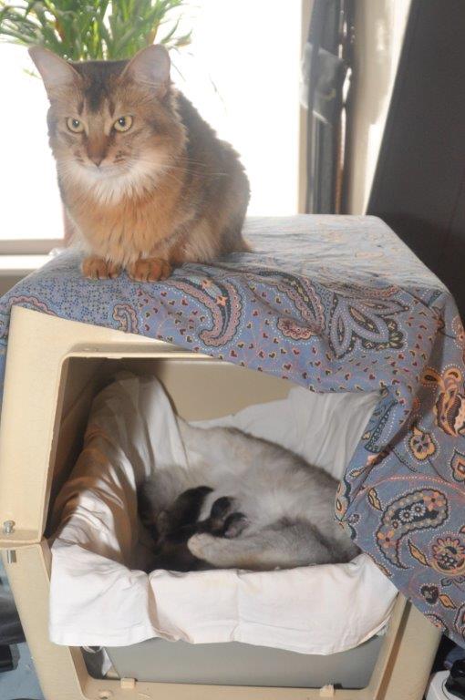Inmiddels ben ik ook weer wat vaker in de huiskamer en het is echt ontroerend om mee te maken hoe de katten beneden lieten merken dat ze me gemist hadden. Vanmiddag namen ze bijna in een rijtje plaats om om de beurt bij me op schoot te kunnen komen. Jack was de eerste, toen was Orchid aan de beurt en Shabanou wachtte bescheiden haar beurt af. Maverick kwam op een andere manier aan zijn portie aandacht. Die lieve kerel was zijn verjaardagsknuffel misgelopen maar de geboorte van zijn nakomelingen in de vierde generatie op zijn elfde verjaardag is vast een prima compensatie.