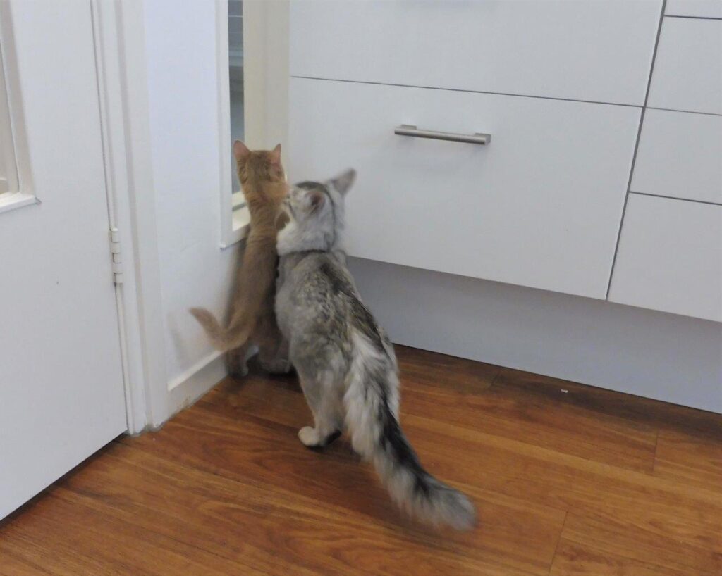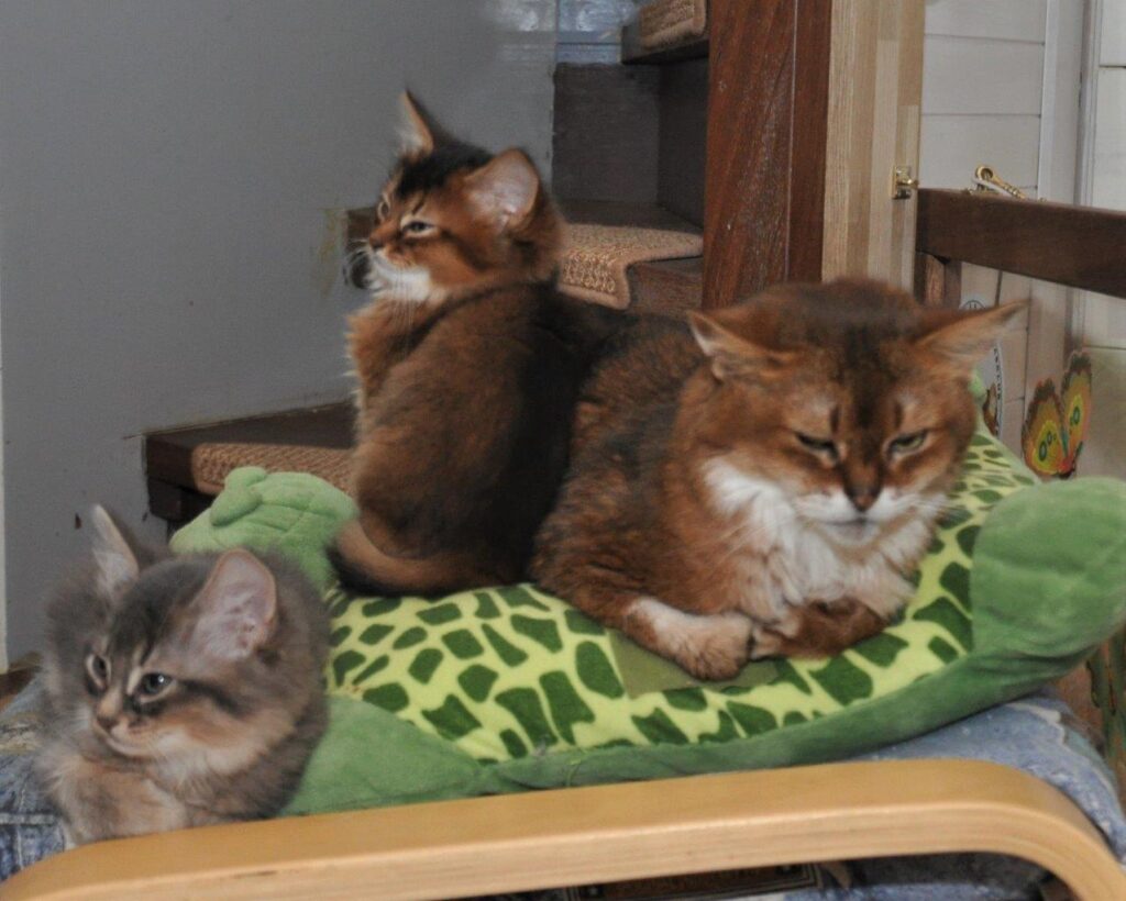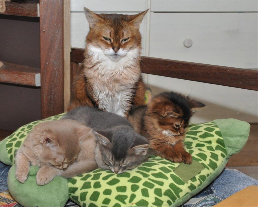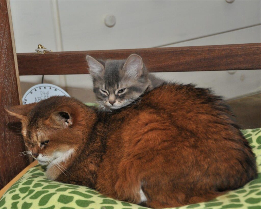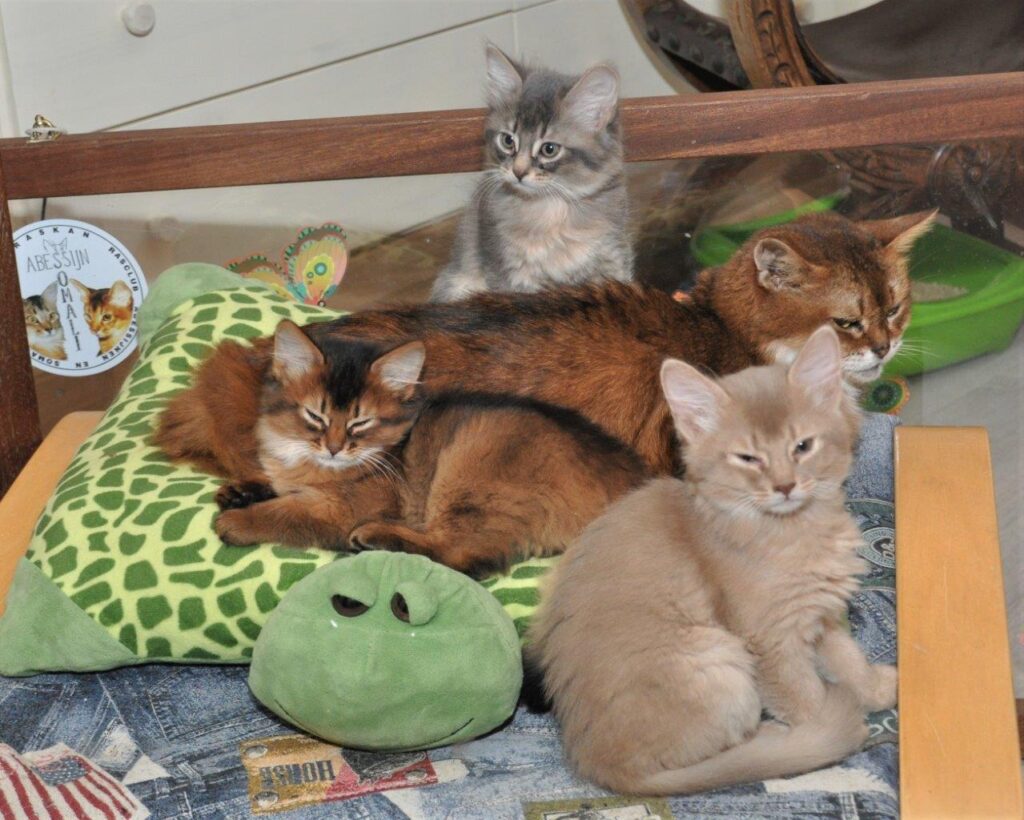Wij kennen Richard al heel lang, hij heeft in 2001 Dewey van ons gekregen en bij toeval ontmoetten wij elkaar weer in een Italiaans restaurant. De liefde voor de Italiaanse keuken hebben we ook gemeenschappelijk. Na de fotoshoot heeft Huibert dus een pasta gemaakt en zo kwamen wij de avond wel door 🙂 Orchid zat gemoedelijk bij Sheralyns kittens. Dat vroeg natuurlijk om een kiek. Ik klikte er lustig op los, digitaal kost toch bijna niets en we hebben zonnepanelen, maar Richards fotografenoog zag dat de foto’s vanuit een andere hoek, ook met mijn camera, nog beter konden. Bij deze dus!