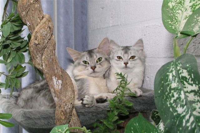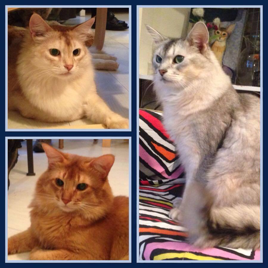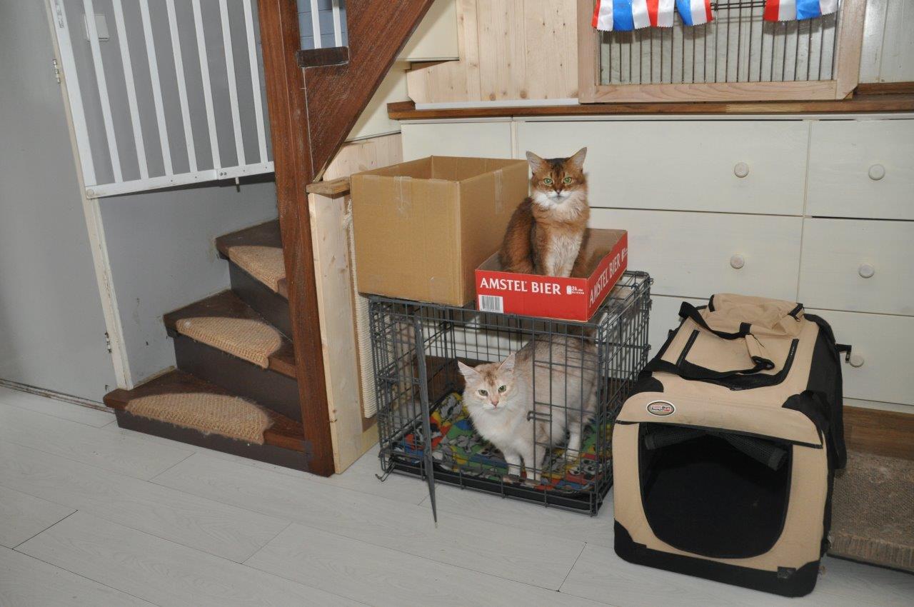 Vorig jaar schrok de lieve Elfie van de even lieve Shabanou, n.b. haar eigen zwartzilveren overgrootmoeder en projecteerde haar angst op iedere kat hier met een soortgelijk uiterlijk met grote ogen. Katten zijn kleurenblind dus zelfs haar sorrelzilveren overgrootvader Jack werd voor een gevaar aangezien toen zij – vast door de hormoontjes – toen ze een nestje had. Dit hebben we opgelost door het tweetal eventjes te huisvesten in twee comfortabel ingerichte benches naast elkaar. Lekkere hapjes, gezellig kletsen en de kans geven om elkaar rustig te kunnen observeren. Omdat beide dieren al vrij snel aangaven geen angstgevoelens (agressie is bijna altijd gebaseerd op angst) voor elkaar te hebben, gaf ik Elfie al snel de gelegenheid om dichterbij de bench van Jack te komen. De lieve Jack gedroeg zich precies zoals het hoorde, nieuwsgierig en vriendelijk en tijdens een volgend extra lekker hapje liet ik ze bij elkaar – resultaat: elkaar herkend en misverstand opgelost.