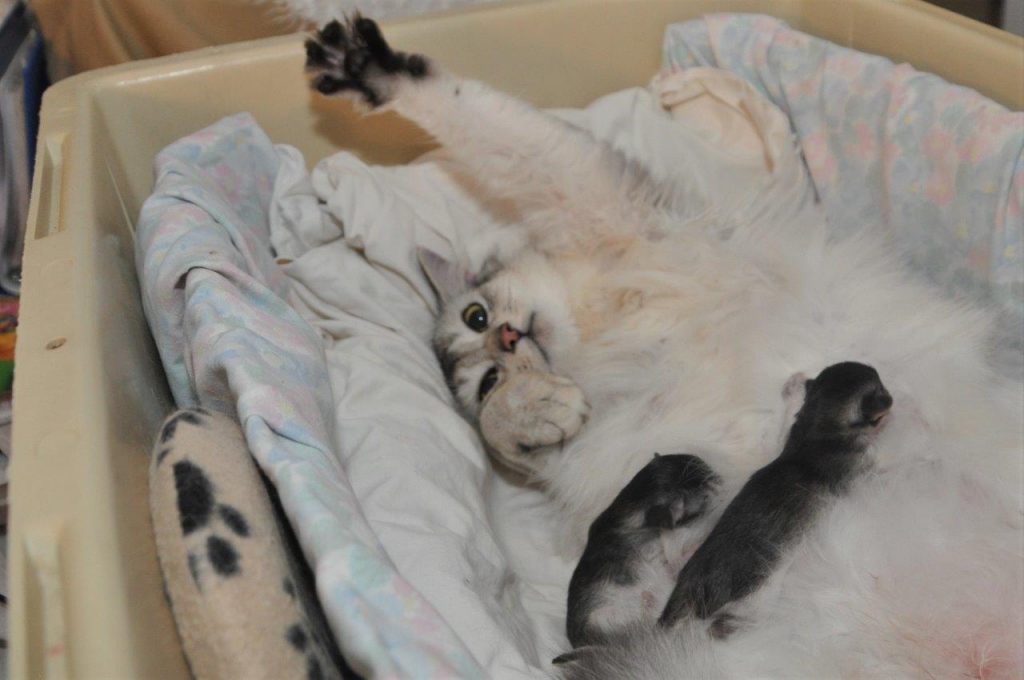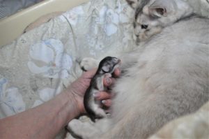 Eerder in de decembermaand had Elfie al een paar dagen bij Per Sé gelogeerd maar toen was het niet gelukt. Dat was best zielig voor beide dieren. Tegen haar gewoonte in werd Elfie weer heel snel krols en mocht ze op herhaling. Gelukkig lukte het toen wel. Slechts één keer maar wel luid en duidelijk. En het resultaat is dus gisteren geboren. Een paar dagen eerder dan verwacht maar beslist niet te vroeg. Elfie had een enorme buik en was heel erg zwaar. Het leek er dus op dat het weer een groot nest zou worden. In 2017 waren het er vijf. Ik was nu, doordat er maar één keer gedekt was geweest, al heel dankbaar wanneer het er meer dan één zou zijn. En dat was het ook: twee! Een zwartzilveren poesje en een dito katertje.
