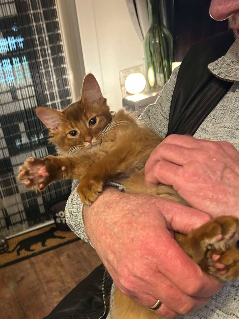 De dappere Frederick deed het uitstekend en de katten van Ellen ook. Zo lief en tolerant. Ze geven hem alle ruimte en wachten geduldig af tot ze echt met hem kunnen kennismaken. Vooraan in die rij staat vast zijn grote oom (echte oom want Koek is een halfbroer van mama Sheralyn) Koek. En daarna komt vast zijn zeer verre achternicht, de zilveren dame Vlo.