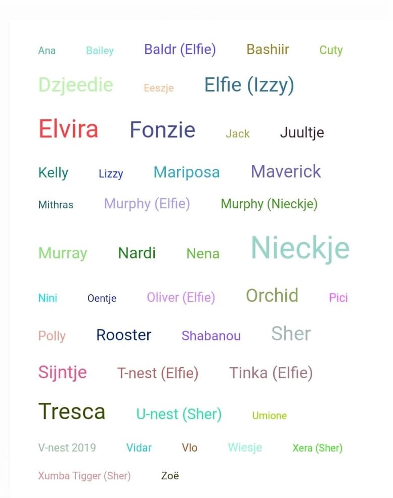 Ik ga mijn best doen om bij de oudere blogs alsnog de tags erbij te zetten zodat deze tagverzameling, zie de homepagina de derde kolom onder de foto van de dag, nog leuker kan gaan worden. Als je op een naam klikt, worden alle blogs gesorteerd waarin iets over dat dier te vinden is. Voor dit nest is hij nog niet compleet. Ik ga kijken of ik dat kan verbeteren. Wanneer de mensen waar de kittens naar toe zijn gegaan af en toe eens een fotootje sturen en ik dat een plekje in een blog geef mét de tag, dan wordt de naam steeds groter. Kampioen op dit moment is Nieckje (2001-2016). Zij woonde bij ons, was een heel bijzonder poesje én was heel fotogeniek. Via haar nakomelingen is zij bijvoorbeeld de overgrootmoeder van de Nea die niet kan mauwen en de betovergrootmoeder van Sher. Dit is haar pagina op deze website.