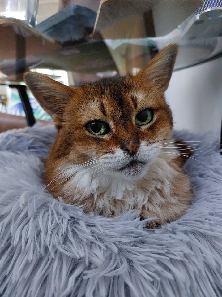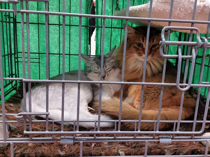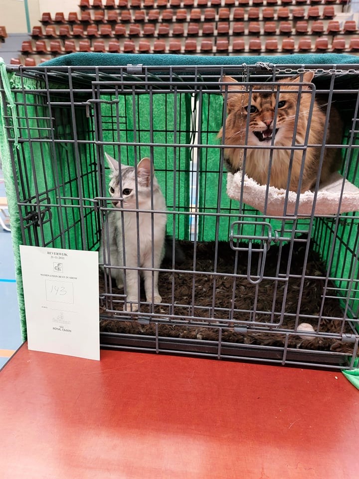 Gisteren was ik met Bodiir en Sher voor de tweede keer op een kattententoonstelling die door Felikat zo corona-veilig mogelijk werd georganiseerd. Heel veel ruimte, duidelijke regels, kortom echt uitstekend. En zo ging het ook met onze dieren én met mij. Ik mis wel de gezelligheid en de levendigheid van de onderlinge contacten. Vooral het even bijpraten met de mededierenliefhebbers die als bezoeker belangstelling tonen. Maar de rust doet mijn inmiddels wat oudere hartje goed. En voor vriendje Bodiir was dit een perfecte eerste kennismaking met het verschijnsel kattenshows en het in handen zijn van vreemden. Ik kan niet anders zeggen dan dat ik super trots ben op hem. Hij gedroeg zich voorbeeldig, had af en toe best wel een bibbertje in zijn lijfje wanneer hij uit zijn veilige bench was maar hij had meer dan voldoende vertrouwen in de mens. Hij is in totaal vier keer gekeurd geweest. De eerste keer door de dierenarts voor de veterinaire keuring en daarna door keurmeester Kristof van Roy en ‘s middags door keurmeester Stephe Bruin. Beiden hadden niets dan lovende opmerkingen over ons dappere vriendje! Bij de tweede keurmeester kon het helemaal niet op. Over zijn lijfje, zijn uitstraling, zijn gezichtje, zijn staart etc. en toen hij vergeleken moest worden met leeftijdsgenootjes om voor de eventuele nominering zei ze dat hij haar favoriet was! Dat horen wij zo graag. Dus dat werd de vierde keuring voor hem. Bodiir was alleen niet de enige mooie kater en hij won de Best-in-Show niet maar onze dag kon niet meer stuk: twee prachtige keurrapporten en deze dag was een hele positieve bijdrage voor zijn totale ontwikkeling waar hij in zijn latere leven alleen maar profijt van zal hebben. Tenslotte is het reizen en dierenartsbezoek ook iets waarvan het prettig is wanneer een dier dit als positief beleeft.