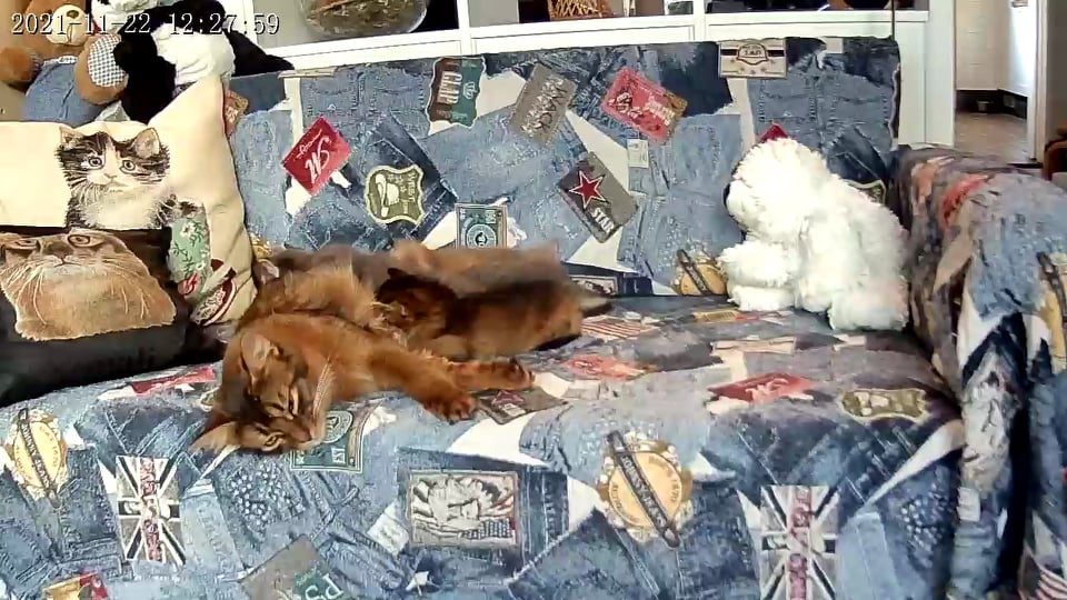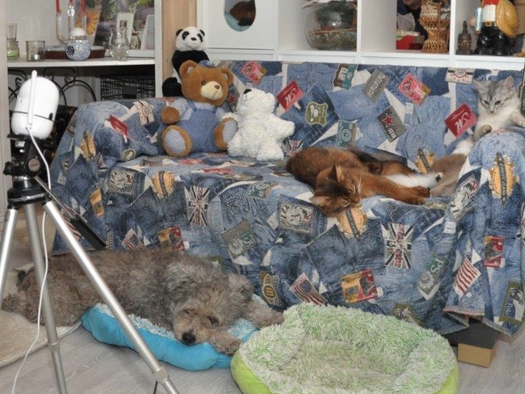 De webcam gericht op de bank. Met Polly ervoor en vriendje Bodiir helemaal rechts.