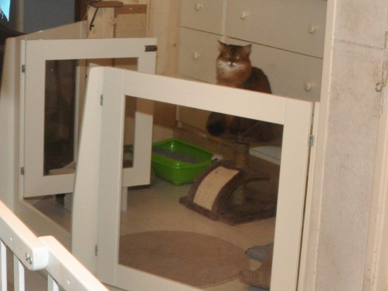Omdat Elfie een conflict heeft met Shabanou en zij zich vanuit haar kleurenblindheid ook soms vergist met de andere zilvers is het wel een heel gedoe om iedere kat hier alle ruimte en aandacht te geven waar ze recht op hebben. De kittens zijn in de hoofdrol en als extraatje voor hun socialisering zijn er eigenlijk altijd wel twee in de huiskamer wanneer een van ons daar ook is. Een een aantal uren per dag moeten de vier oudjes naar boven zodat Elfie en Bashiir en alle vier de kittens dan beneden kunnen zijn. In het begin liep dit viertal nog wel braaf met me mee de trap op, zeker wanneer ik wat lekkers mee had, maar het begint ze te vervelen. Zeker Jack tekent protest aan. Dat is dus een nadeel van aanhankelijke katten. Boven hebben ze twee kamers en een buitenren dus aan de ruimte ligt het niet; het gaat ze echt om de menselijke aanwezigheid.