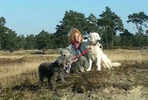 Ik in 2012 met Pici, Polly en Eesz op de heide in Friesland.