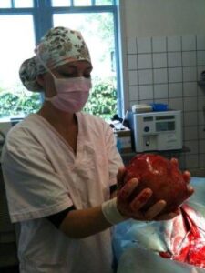 Met zo’n operatie hebben we ooit met Eesz een geweldige positieve ervaring mee opgedaan. De lieve meid bleek een tumor van 1.2 kilo in haar buik te hebben, Eesz was een grote hond maar 1.2 kilo was ook voor haar een grote tumor. Hij bleek niet kwaadaardig en Eesz heeft nog drie jaar in een voor haar leeftijd hele acceptabele conditie van het leven mogen genieten en heeft zelfs de 16 jaar nog gehaald.