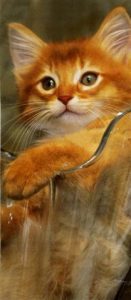 Het kleurverschil is trouwens opvallend. Jamie en de eerste drie sorrel kittens van het vijftal dat deze site siert zijn allemaal sorrel Somali’s en deze drie hebben een intensievere kleur dan Jamie terwijl Jamie toch peentjesoranje overkomt. E.e.a. heeft vast te maken met de kwaliteiten van de fotograaf en de apparatuur. Deze foto van Jamie is niet door mij gemaakt en foto’s staan of vallen nu eenmaal met de juiste belichting.