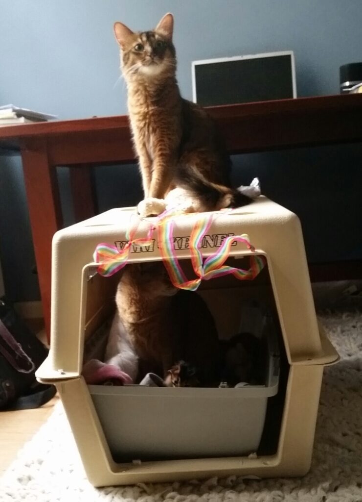 Vroeger was een vierkant houten kistje dé kraammand in een altijd openstaande dubbele kooi. De poezen moederden de eerste drie weken bijna altijd in de huiskamer. Op een gegeven moment kwam de slaapkamer meer in zwang bij de meiden en creëerde ik van oude grote transportmanden een kraammand die zodanig in de smaak viel dat hij in de huiskamer ook in gebruik kwam. Alleen voor Jewel ben ik er één keer vanaf geweken. Ik had van een nieuwe verhuisdoos een kraammand gemaakt en ook nog opgeleukt met fotootjes van familieleden. Helaas had dit fatale gevolgen: de instap bleek onhandig en de locatie waar hij stond was dat ook waardoor de lieve Jewel ‘s nachts er maar lastig in kon komen en met een pootje op het enige poesje van haar nest terecht was gekomen. We hebben het prachtige kittentje in Utrecht laten onderzoeken en inderdaad bleek dat schade aan de ribbetjes etc. de oorzaak was.