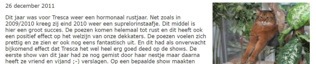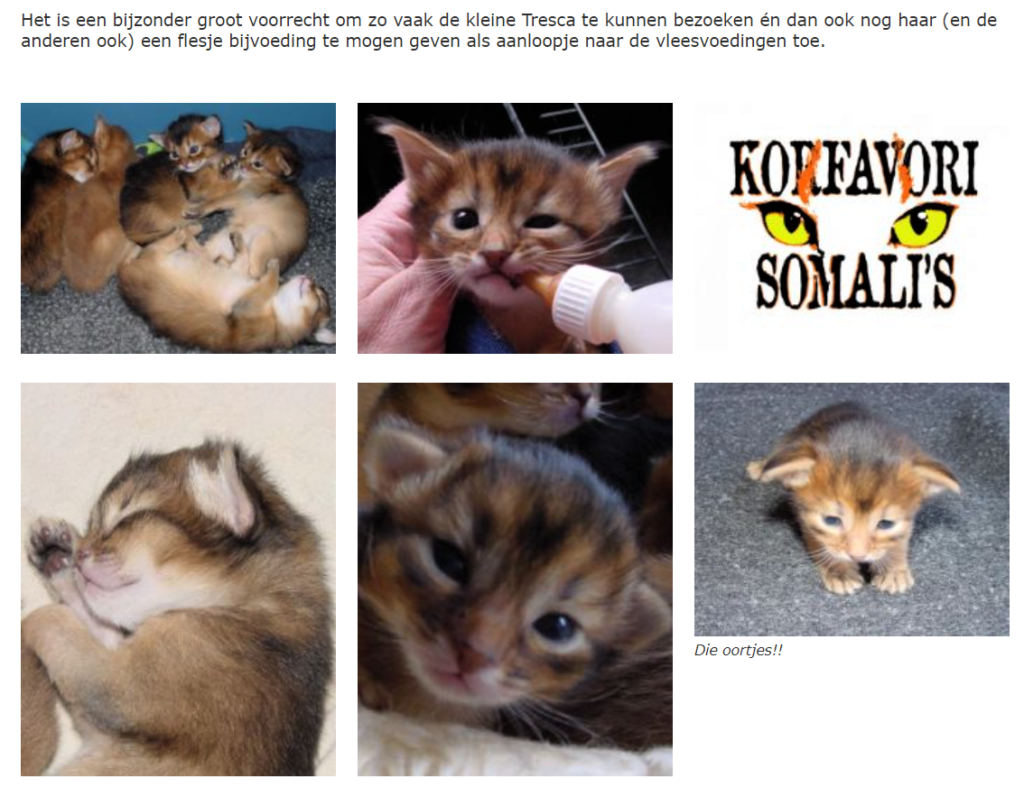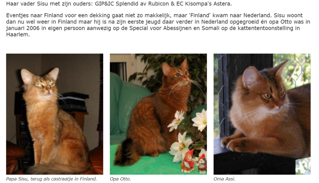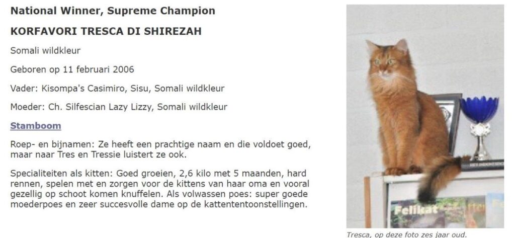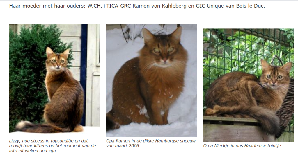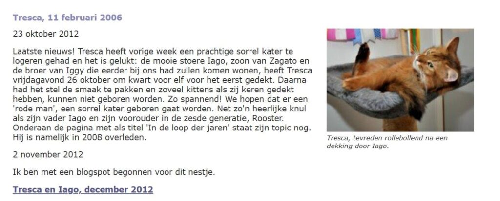 De link hierboven naar het nest van Tresca en Iago werkt natuurlijk niet omdat dat stukje een afdruk is. Dit is de goede link inclusief de berichtjes van de nieuwe eigenaren van dit prachtige nestje. Ze zijn nu 8,5 jaar oud en maken het allemaal goed. Allemaal blije eigenaren die regelmatig wat van zich laten horen. Ik denk dat Belle de mooiste Somali is die ik ooit gefokt heb!