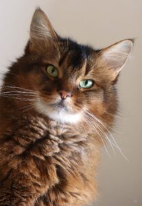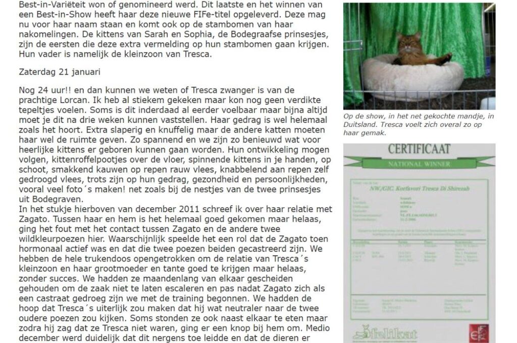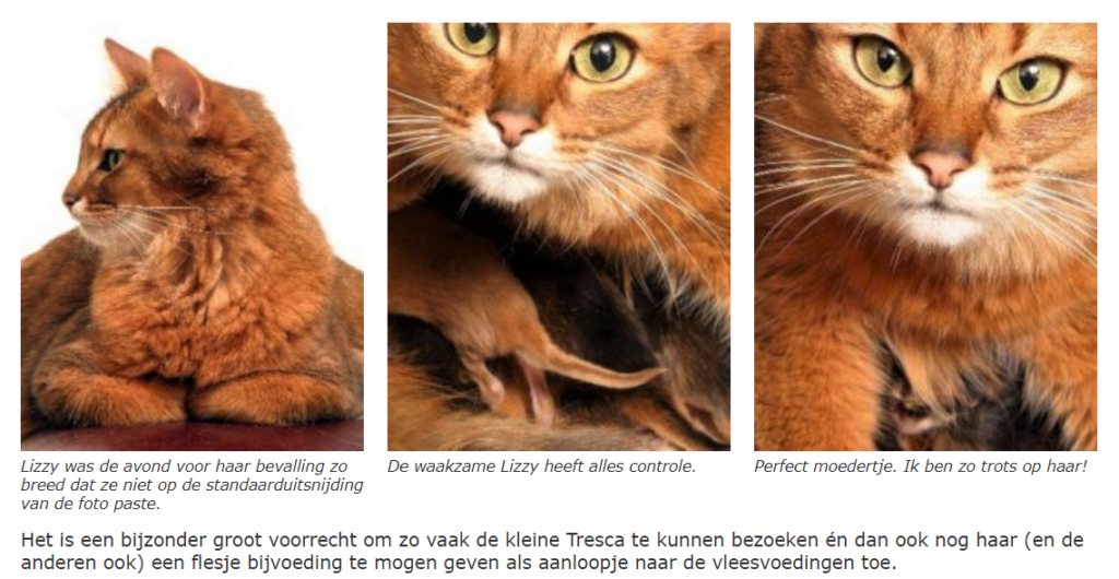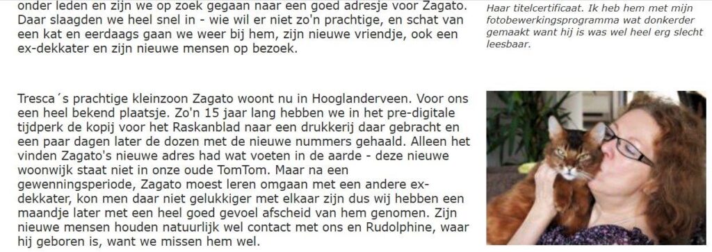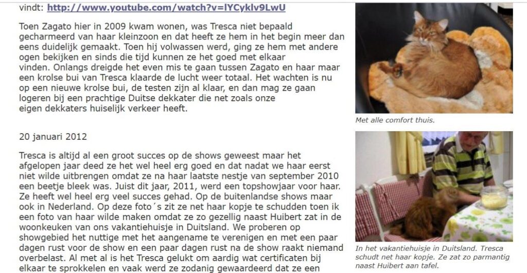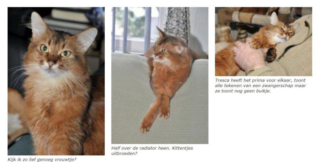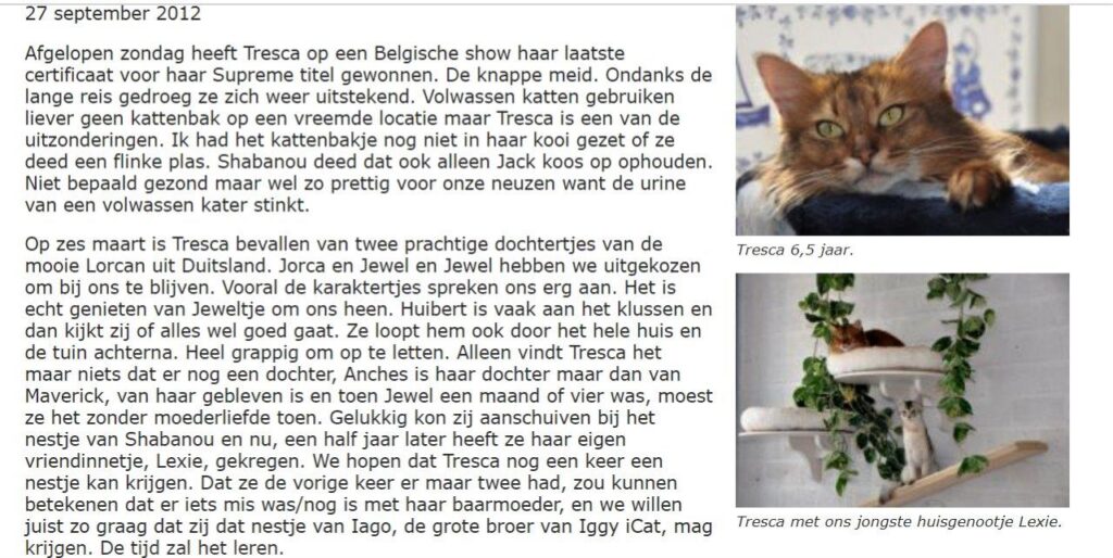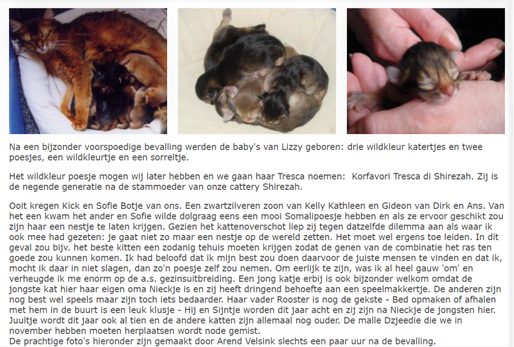 De link hierboven naar het nest van Tresca en Iago werkt natuurlijk niet omdat dat stukje een afdruk is. Dit is de goede link inclusief de berichtjes van de nieuwe eigenaren van dit prachtige nestje. Ze zijn nu 8,5 jaar oud en maken het allemaal goed. Allemaal blije eigenaren die regelmatig wat van zich laten horen. Ik denk dat Belle de mooiste Somali is die ik ooit gefokt heb!