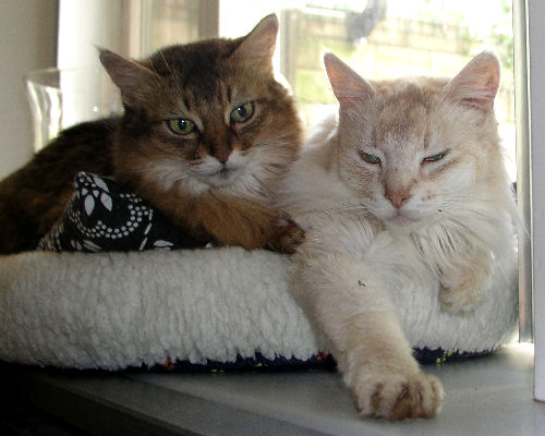 Vandaag kwamen Rudi en Angela op bezoek. Lekker knuffelen met de katten, leuke cadeautjes meegebracht, voor de katten maar ook een hele speciale voor ons: een windorgeltje uit Indonesië die wanneer de wind hem aanraakt ons met een zacht tingeltje aan Elvira kan laten herinneren. Ook had Rudi een fotoboekje mee met foto’s van de eerste jeugd van haar Moosje Mohandas. Hij was van het O-nest van Elvira en Murray uit 1995. Het was heel mooi om deze foto’s weer eens te kunnen zien en ik heb er een aantal ingescand die een plekje op deze site gaan krijgen. Angela is de computerexpert en zij gaat proberen om nog een aantal dierbare foto’s uit een gecrashte Mac te halen. Daarbij kan ze ook aardig met de fotocamera omgaan – wie weet verschijnen hier eerdaags nog wat kiekjes van haar hand/Canon.