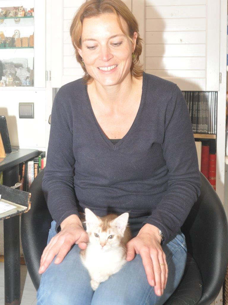 Vorige week donderdagochtend, vlak voordat de dierenarts hier zou komen, ging er iets goed mis. Maverick sprintte de trap af en racete door het kattenluikje naar buiten maar helaas reageert onze hond Polly af en toe op dit soort gedrag door in de achtervolging te gaan. Ze denkt dat ze hier, net als haar rasgenoten vroeger bij de kuddes, de orde moet bewaren. Maverick schrok ervan en kwam voorzichtig terug om te kijken of de kust al weer veilig was. Die was niet veilig want moeder Elfie interpreteerde het gerace van hem, de drukte van Polly én zijn grote ogen (dan lijkt hij op Shabanou waar zij bang voor is) als gevaar voor haar kittens en ze zou in de aanval gaan.