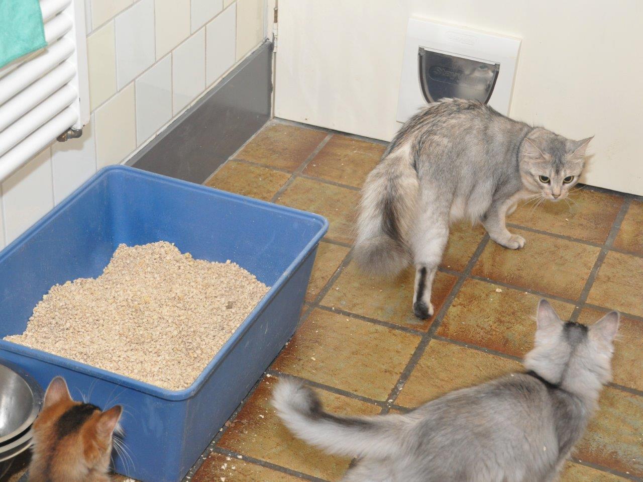 De kittens gaan sinds een aantal dagen heel makkelijk door de kattenluikjes. Heel vaak kiezen ze er zelfs voor om de kattenbak met Cat’s Bestvulling te negeren en gaan ze doelbewust door het luikje naar de kattenbakken met Silicavulling achter die deur. Nog eventjes en deze bak kan de keuken uit. Ik vind het maar niets al die rommel daar. Er is niet tegenaan te vegen of te stofzuigen. De bakken in de huiskamer zijn al weg. Heerlijk. Deze vulling stinkt gelukkig niet. Dat deed de kittenveilige vulling van BreederSelect wel. Een klein plasje was al voldoende om ontzettend snel een amoniaklucht te verspreiden. Mijn hulp in de huishouding viel dat ook al op. Een huishouden met zeven katten en een hond ruikt uiteraard anders dan een huishouden zonder dieren maar het mag niet stinken.